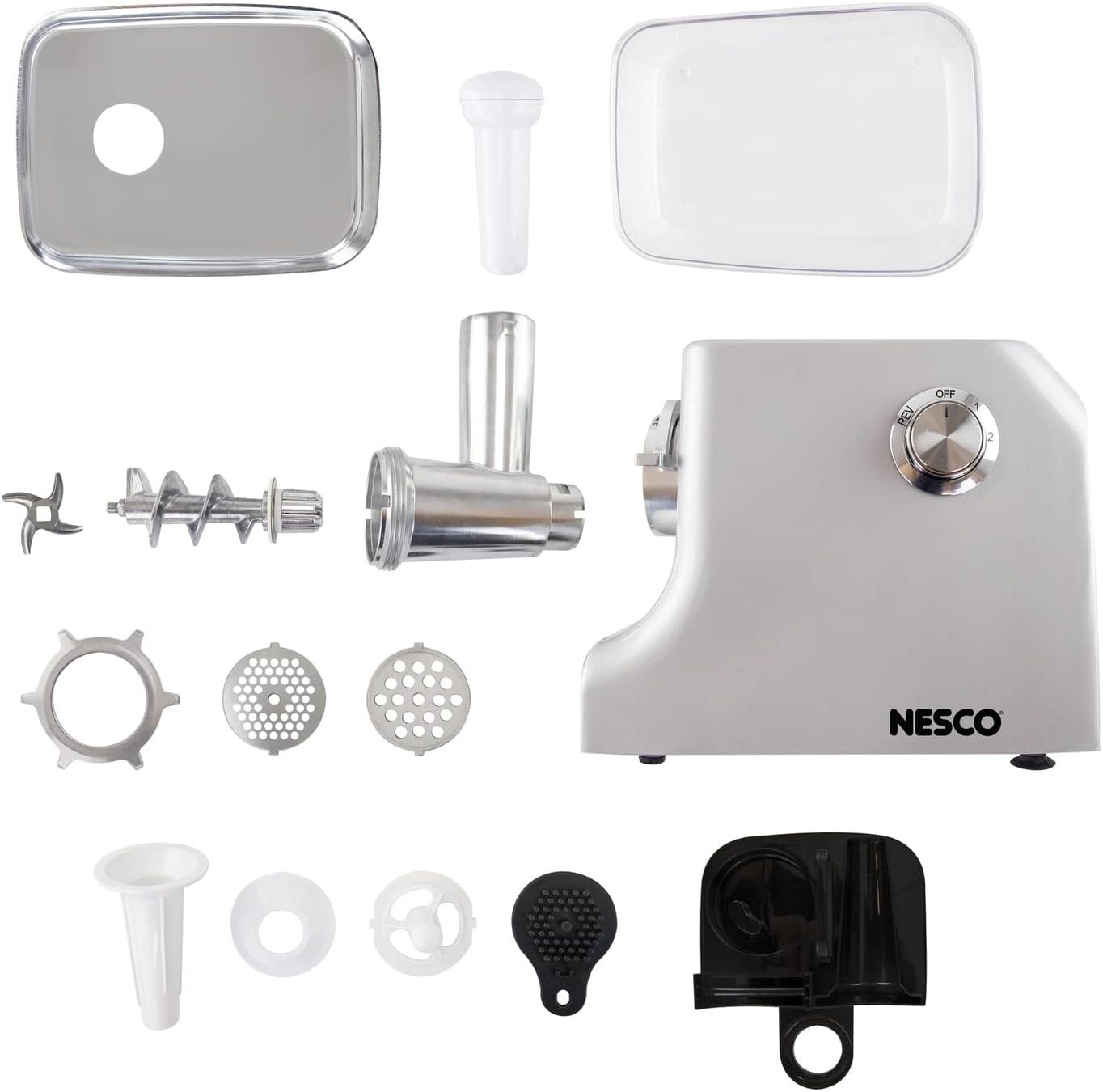 The NESCO #8 Food Grinder is ideal for processing wild game into sausage, hamburger, and other ground meat. Grinding your own meats at home allows you to include unique blends of healthy ingredients to ensure higher quality results and better flavor. The 750-watt motor and die-cast hopper provide the power and capacity to grind generous portions of meat in a short amount of time. The heavy-duty cutting blade and grinding plates can process up to 2.5 lbs. of meat per minute. The reverse auger function helps to eliminate jamming and ensures continuous use, while the stable design prevents tipping. Catch your ground meats in the hopper cover that can also be used as a meat tray. An integrated parts carrier holds all accessories and conveniently nests inside the hopper for compact storage. The aluminum #8 grinder head assembly is removable for easy cleanup. It includes a food pusher, sausage-stuffing attachments, and a plate-cleaning pad for versatility and ease of use. Whether you’re making mom’s famous meatloaf with the family or hamburgers for the grill, the NESCO Food Grinder provides gourmet results and puts you in control of the grind.