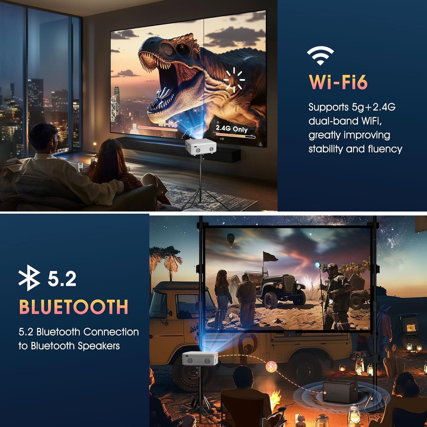 WiFi 6 and Bluetooth 5.0: Supports 2.4G and 5G WiFi connections, ensuring lag-free online gaming, streaming experiences, and seamless video streaming. Additionally, the projector equipped with Bluetooth 5.0 allows you to easily connect to your desired soundbar, headphones, or other audio devices.]