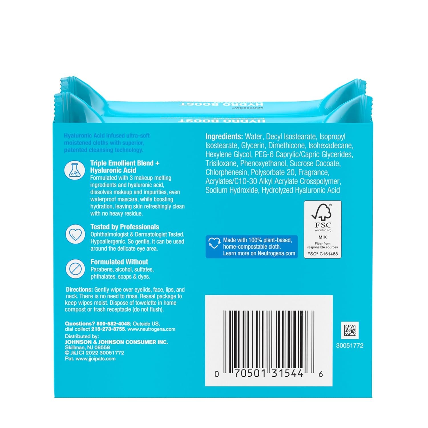 Pack of Two, 25-count Neutrogena Hydro Boost Face Wipes. Facial cleansing wipes with hyaluronic acid, made with 100% plant-based cloth, these makeup remover wipes eliminate up to 99% of makeup, oil, and sunscreen, boosting hydration for 24 hours