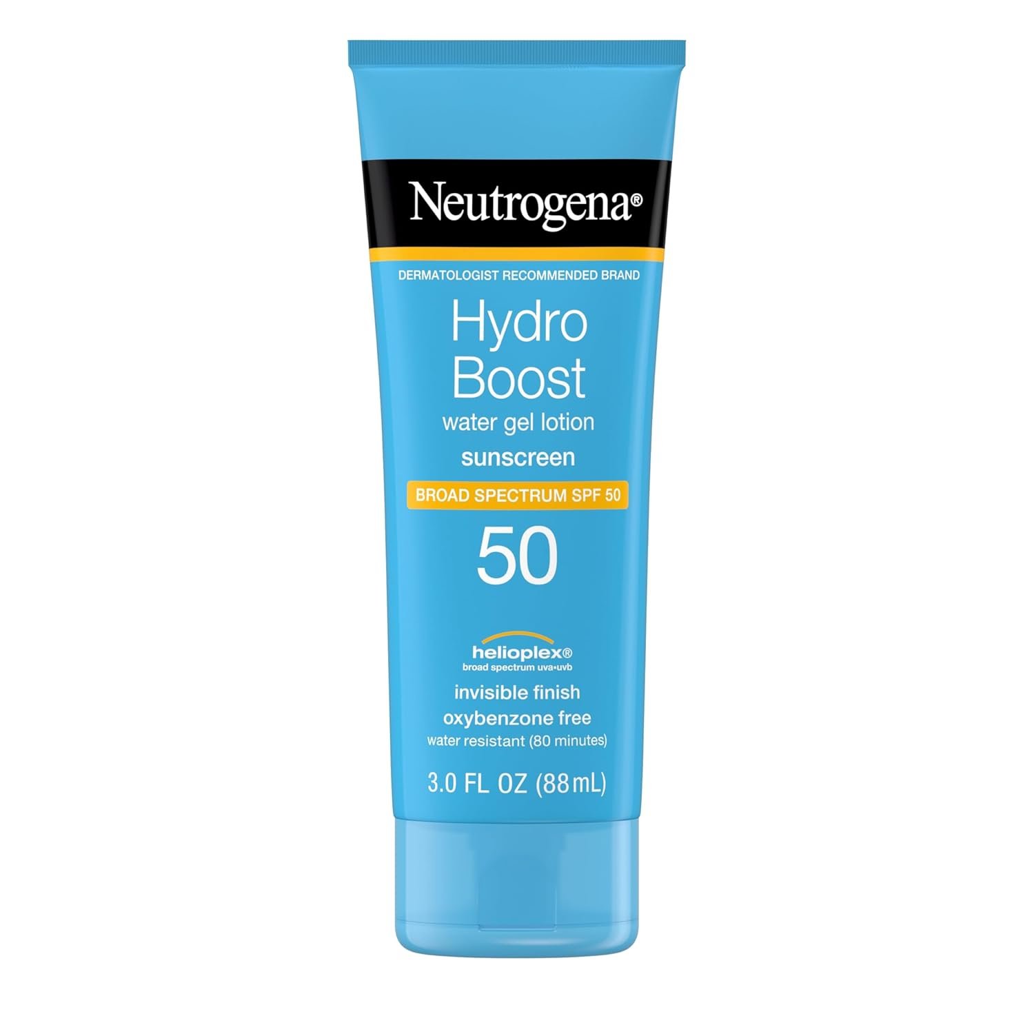 3-fluid ounces of Neutrogena Hydro Boost Water Gel Sunscreen Lotion with broad spectrum SPF 50 that offers UVA/UVB protection as it helps hydrate skin without the greasy feeling