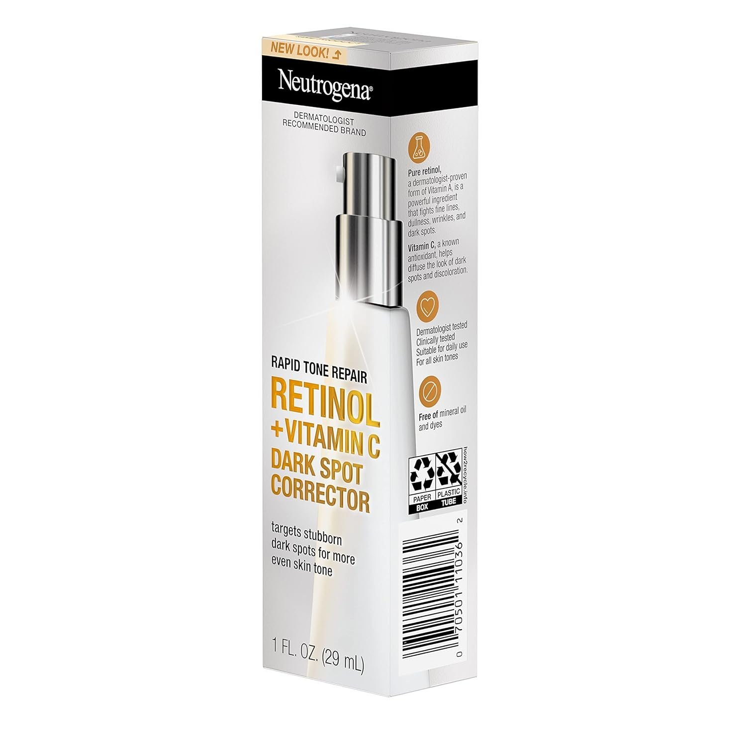 1-fluid ounce tube of Neutrogena Rapid Tone Repair Retinol + Vitamin C Dark Spot Corrector Daily Face Serum with a dermatologist-proven retinol and Vitamin C to target stubborn dark spots for more even skin tone