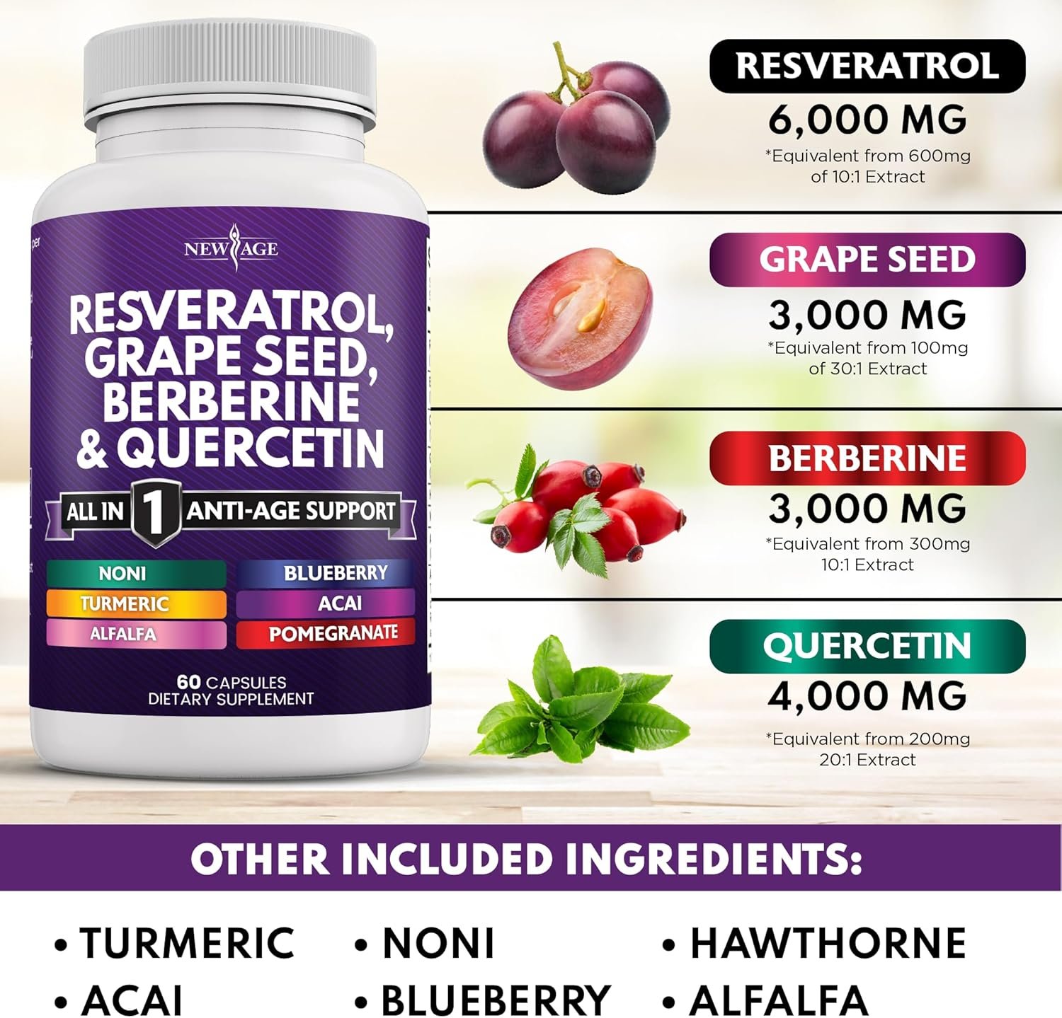 The Comprehensive Blend – Grape Seed Caps & Berberine – Explore New Age Resveratrol for a diverse range of potent supplements, including Resveratrol Berberine, Quercetin, Grapeseed Capsules, Acai, Noni, Blueberry, Alfalfa, and Pomegranate. Conveniently, it’s just 2 capsules. A more robust alternative to berberine 1500mg, quercetin 500mg, or berberine 1000mg, all in one blend.