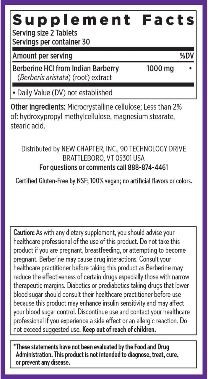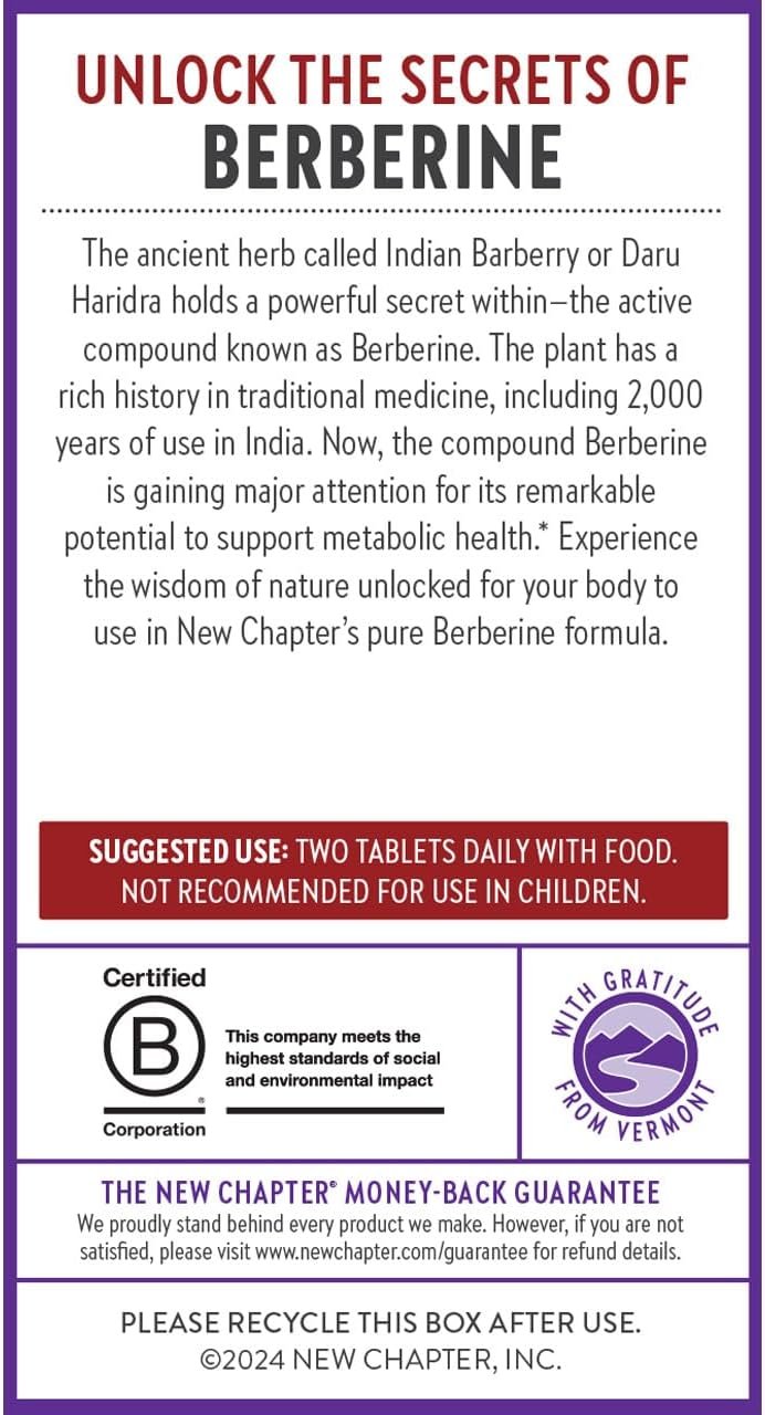 The benefits of Berberine supplements are perfect for 21st century well-being and vitality. Berberine 1000 mg from New Chapter® is masterfully crafted to support your heart health and overall metabolic health (how the body converts food into fuel).* Convenient to take with any meal or snack. Add our excellent-quality 2-tablet formula to your wellness journey and feel the difference that Nature’s pure herbs can make! Each serving delivers 1000 mg of 30x concentrated Berberine extract from authentic Indian Barberry root (Berberis aristata). *These statements have not been evaluated by the Food and Drug Administration. This product is not intended to diagnose, treat, cure, or prevent any disease.