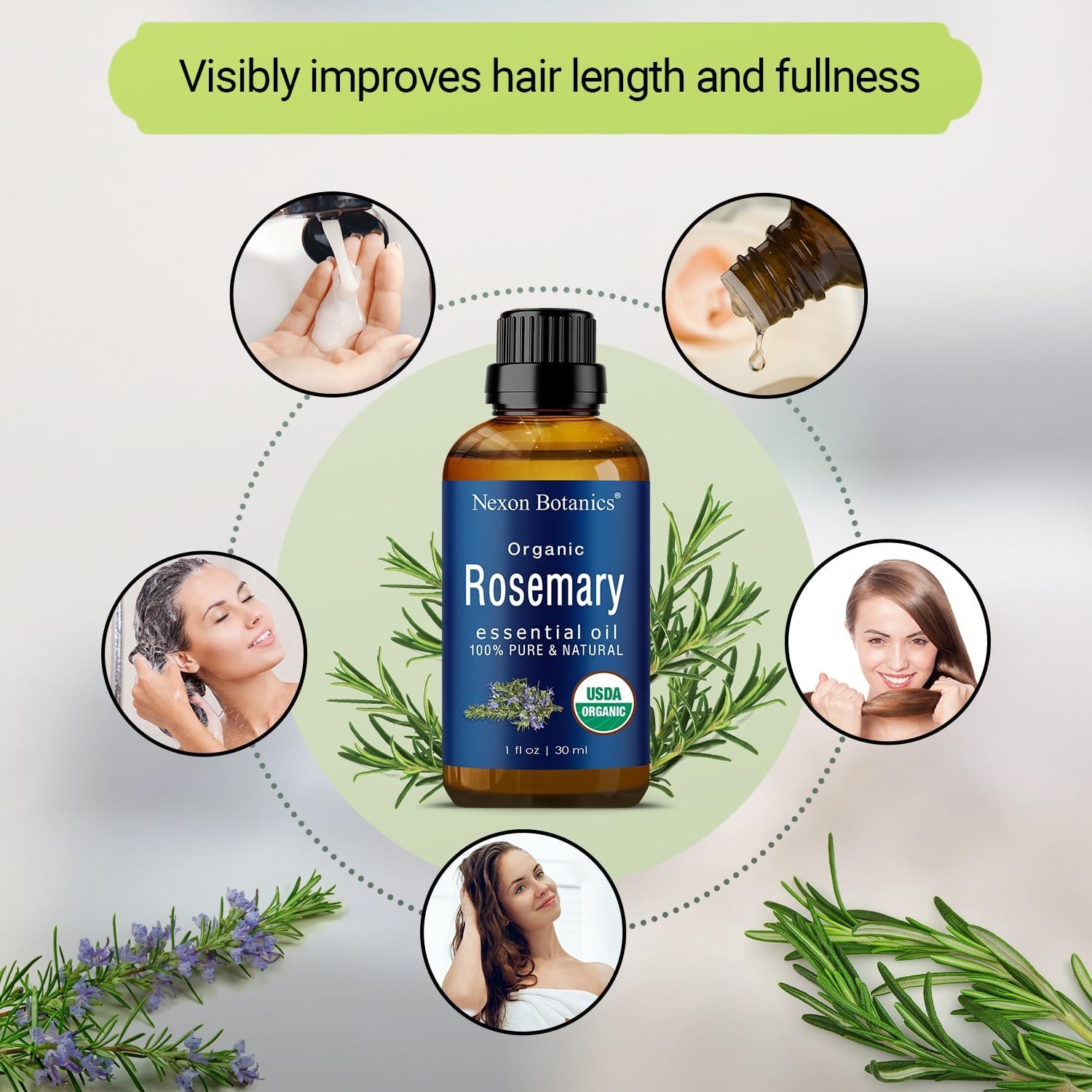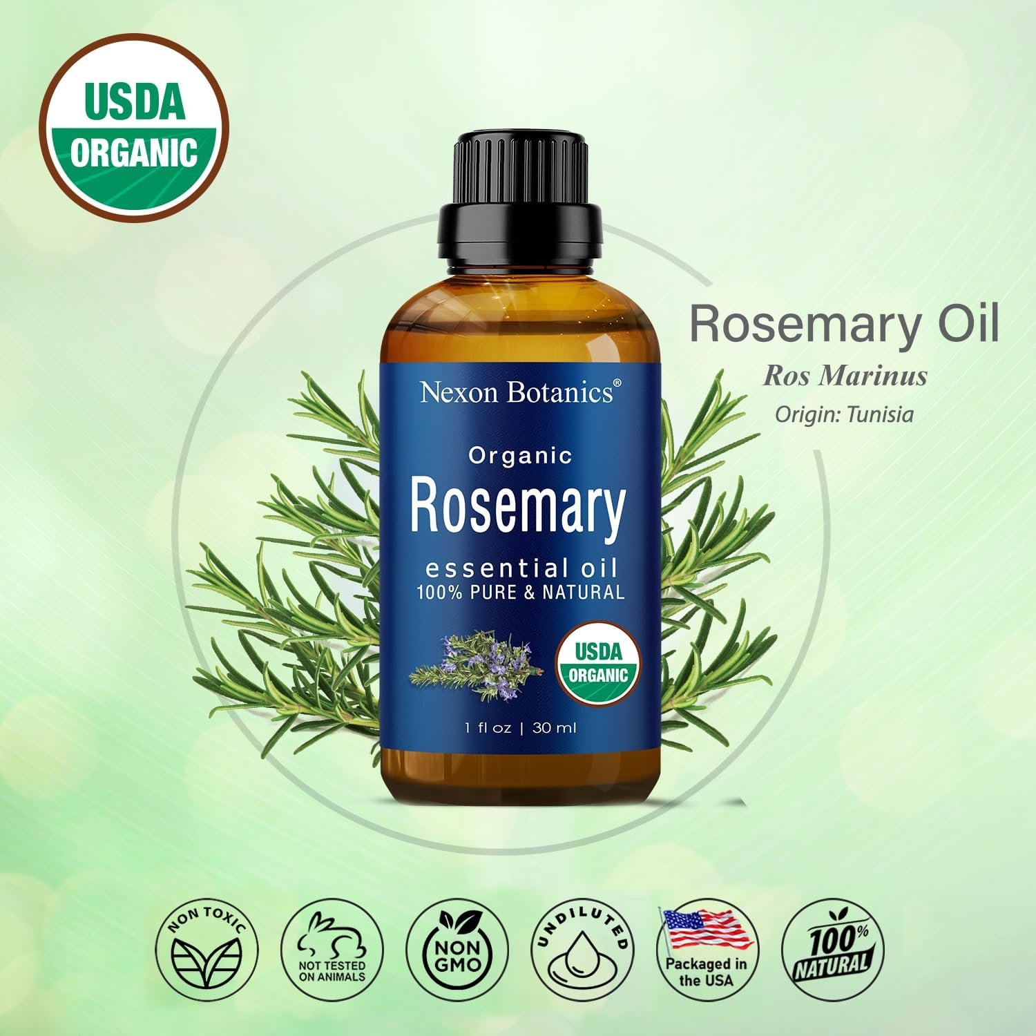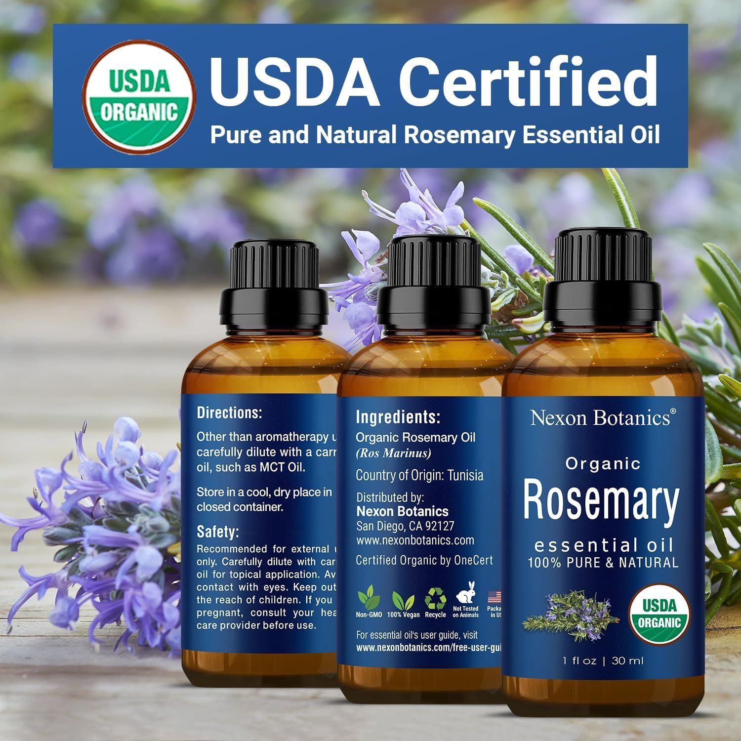 Nexon Botanics’ Organic Rosemary Essential Oil is certified, and contains the purest properties of rosemary oil. It is Non-toxic, unfiltered, and undiluted with no fillers.