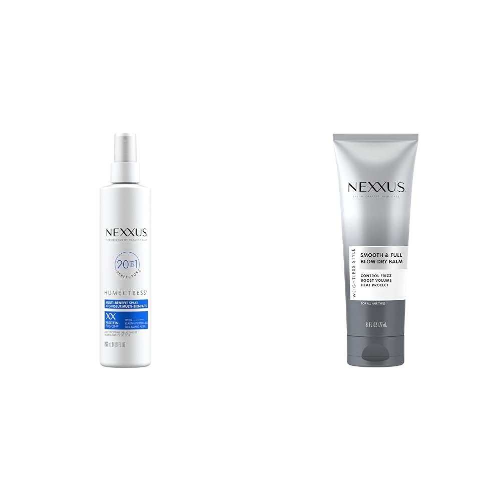 Use the Nexxus Humectress Leave-In Conditioner Spray on either dry or damp hair before blow drying, air drying, or styling. Gently comb through hair to distribute the product evenly. It works best when paired with the Therappe Shampoo and Humectress Conditioner. The Nexxus Weightless Style Blow Dry Balm should be used prior to blow-drying hair to heat protect, give frizz control, and boost volume. Apply it from root to tip before blow-drying.