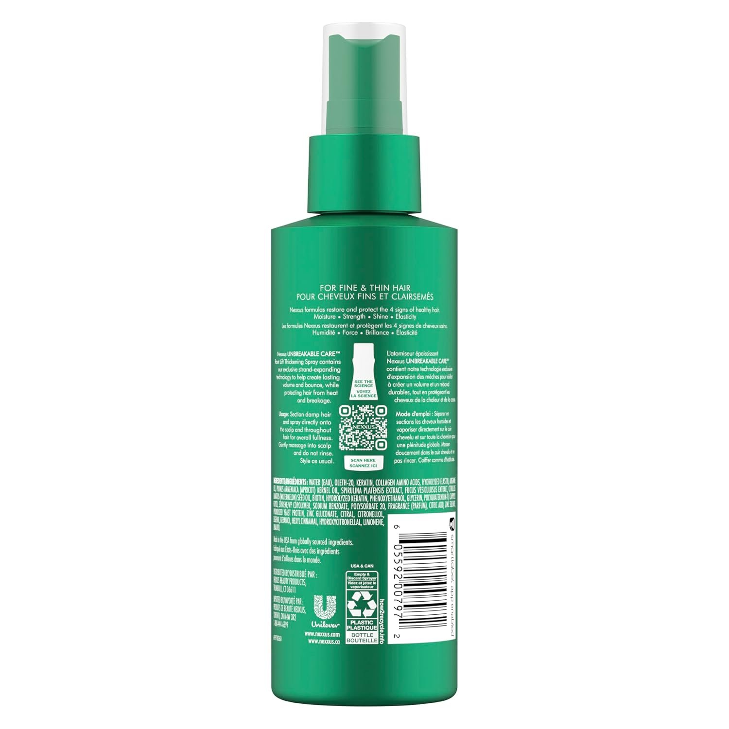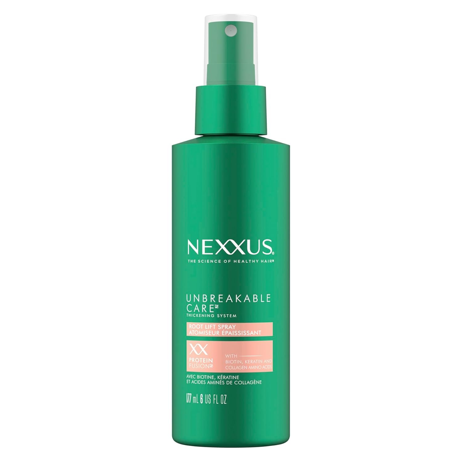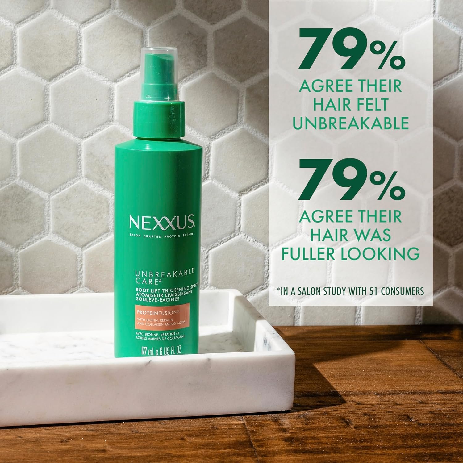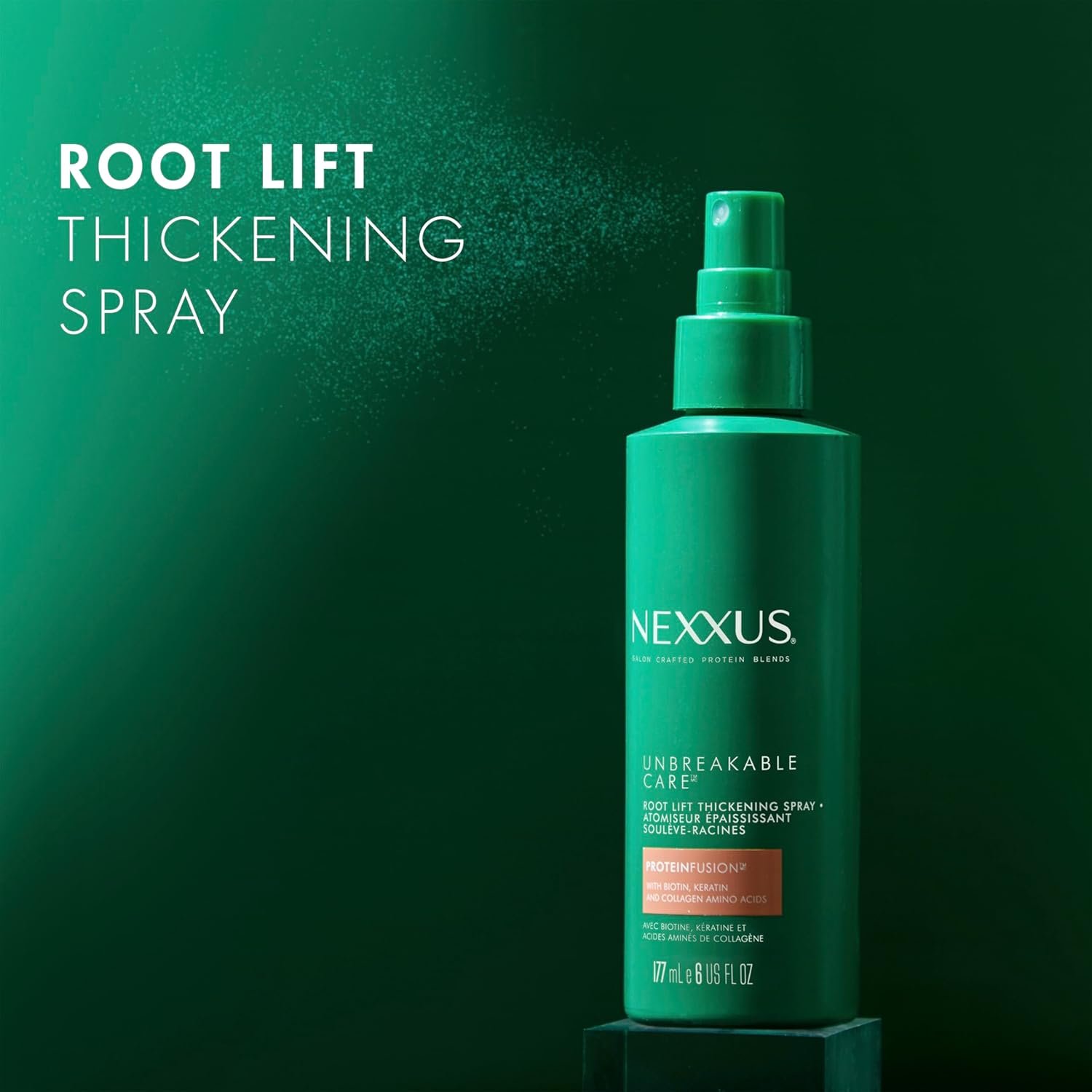 Experience the Unbreakable Care Root Lift Spray by Nexxus. This powerful formula of root thickening spray is your secret weapon for achieving voluminous, full-bodied hair that defies gravity. Powered by cutting-edge science, our root lift spray features an exclusive strand-expanding technology that thickens each individual strand from root to tip, creating lasting volume and bounce that lasts all day. Say goodbye to flat, dull hair and hello to hair that grabs attention with its luxurious thickness and vitality. Formulated with our signature ProteinFusion blend enriched with biotin, keratin, and collagen amino acids, this spray strengthens and protects your hair from within, ensuring it stays healthy and resilient against daily styling and environmental stress. How to use: It’s simple to apply. Section damp hair and spray directly onto the scalp and throughout the hair for overall fullness. Gently massage into the scalp and style as usual. We recommend using this root lift spray in combination with our Unbreakable Care shampoo and conditioner for even better results. Trust Nexxus, where salon expertise meets scientific innovation. Our Unbreakable Care Collection is designed to help retain hair by reducing breakage while maximizing fullness, giving you the confidence to enjoy your thick, beautiful hair every day. Elevate your haircare routine with Nexxus Unbreakable Care Spray and unleash the full potential of your hair.