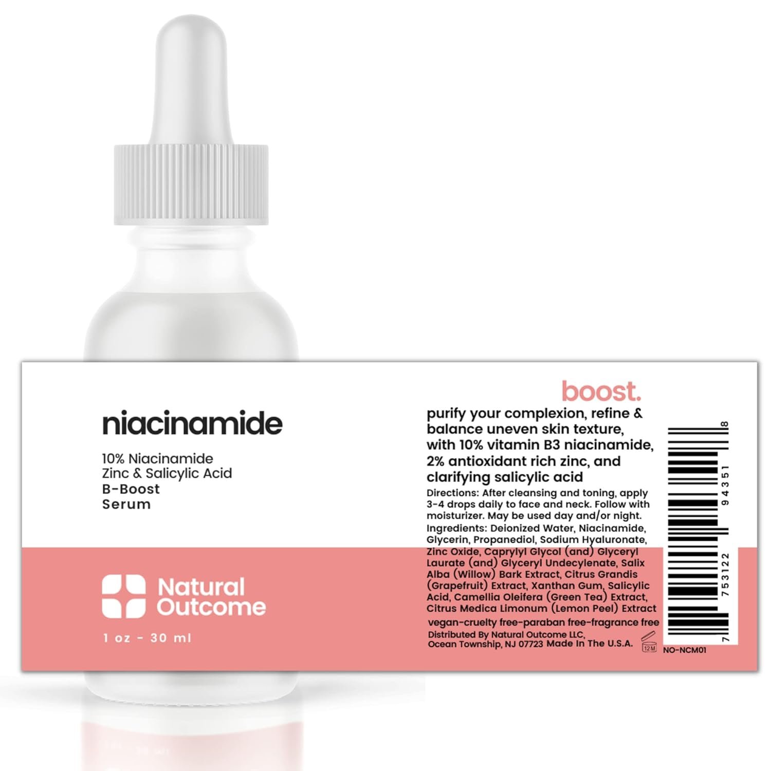 Niacinamide Serum for Face by Natural Outcome Skin Care, B-Boost Niacinamide 10% Plus Zinc 2% Salicylic Acid + Hyaluronic Acid, Acne Treatment + Pore Reducing Serum + Even Skin Toner