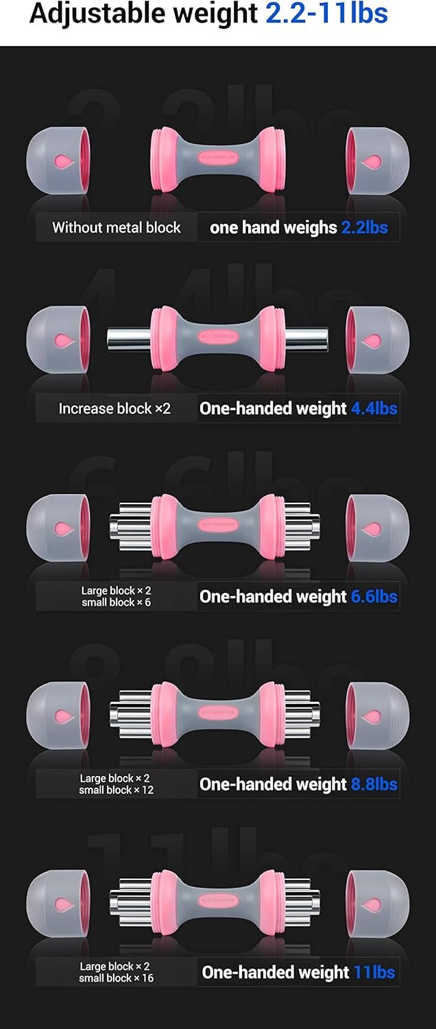MULTI-WEIGHT SETTING: The dumbbell alone weighs 2.3 lbs. each. Weight bars are included to allow you to adjust the weight of your dumbbell. There are 16 small and 2 large weight bars per dumbbell. The small bars weigh 0.4 lbs. each and the large bars weigh 1.25 lb. each. In order for the sides to be even, you must add them equally on each side. The lowest weight is 2.3 lbs. and the highest weight is 11.2 lbs. per dumbbell.