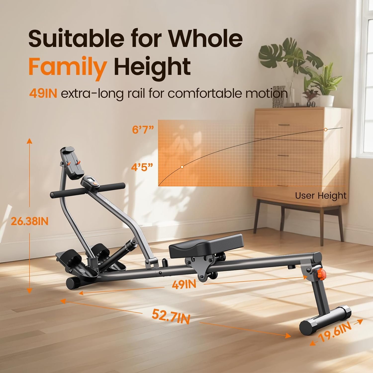 Family-Friendly Design: Niceday rowing machine features 49in extra-long rail, providing a comfortable and effective exercise for users from 4’5″ to 6’7″; Suitable for the whole family to use together