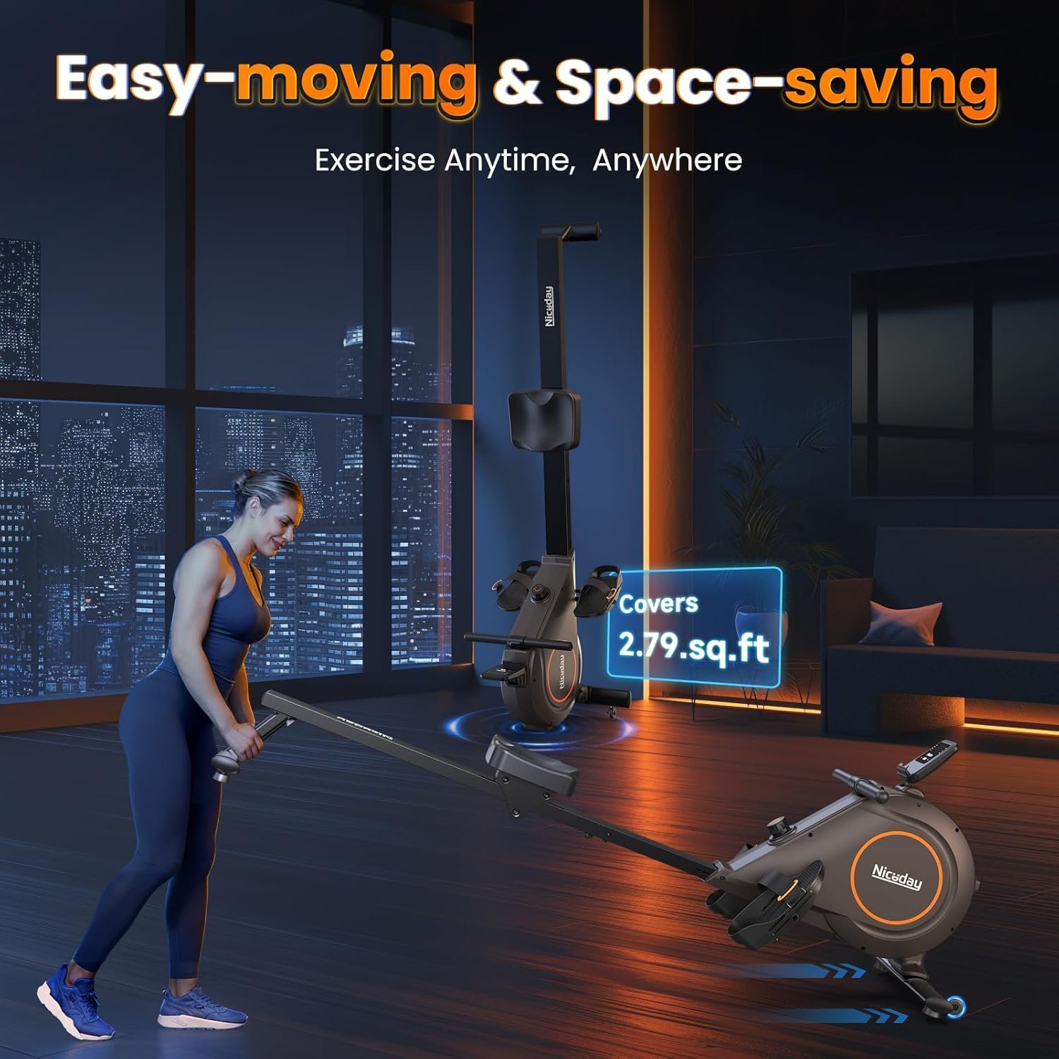 Space-Efficient Design: Designed for compact indoor gyms, its upright foldable storage takes up only 2.79 square feet; The built-in wheels allow for easy relocation to your row machine after workouts