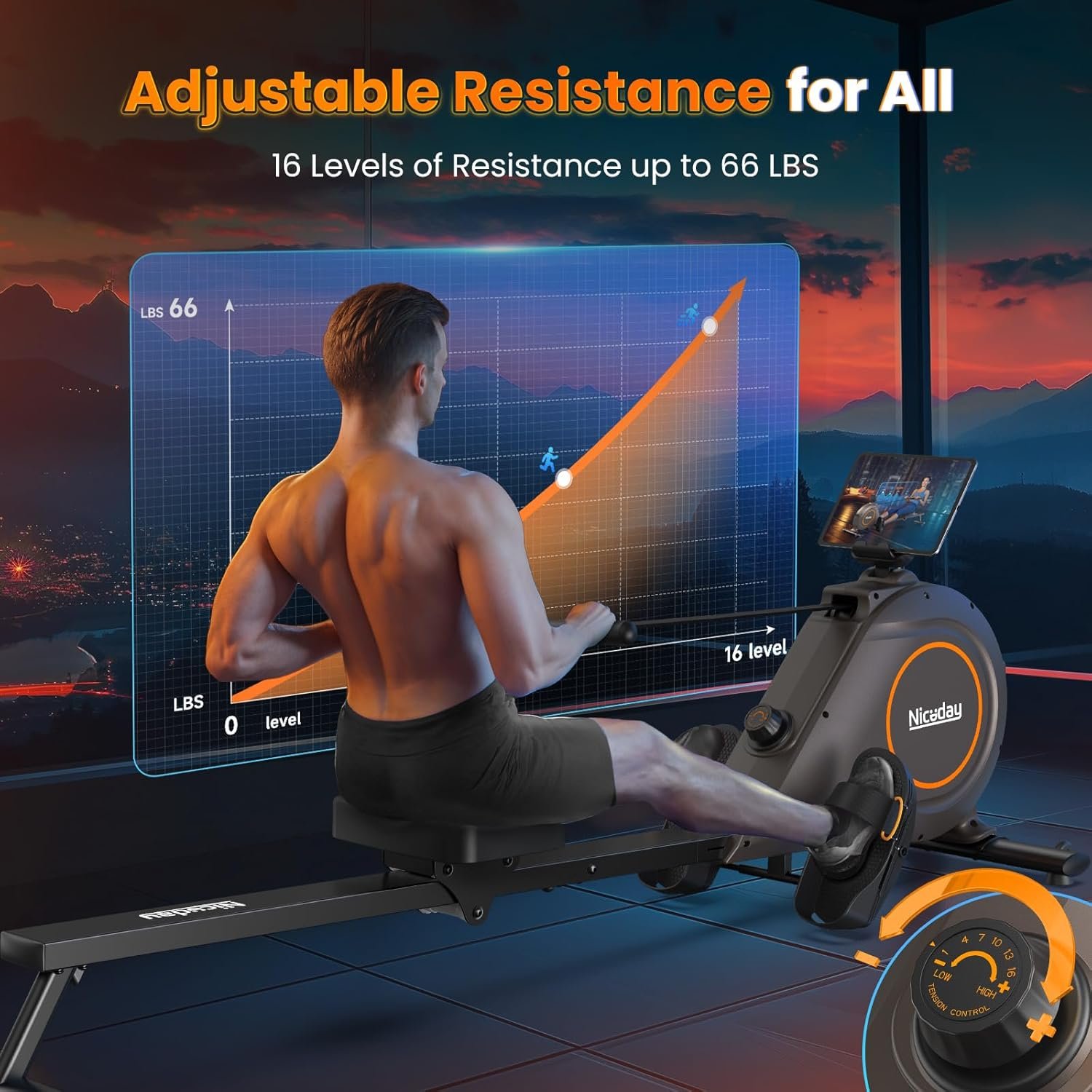 Tough Flywheel for Powerful Magnetic Resistance: The Niceday Rowing Machines for home features a 12 lbs flywheel, delivering resistance up to 66 lbs, catering to your explosive and strength training needs; With 16 adjustable resistance levels, it suits both beginners and professionals for effective workouts