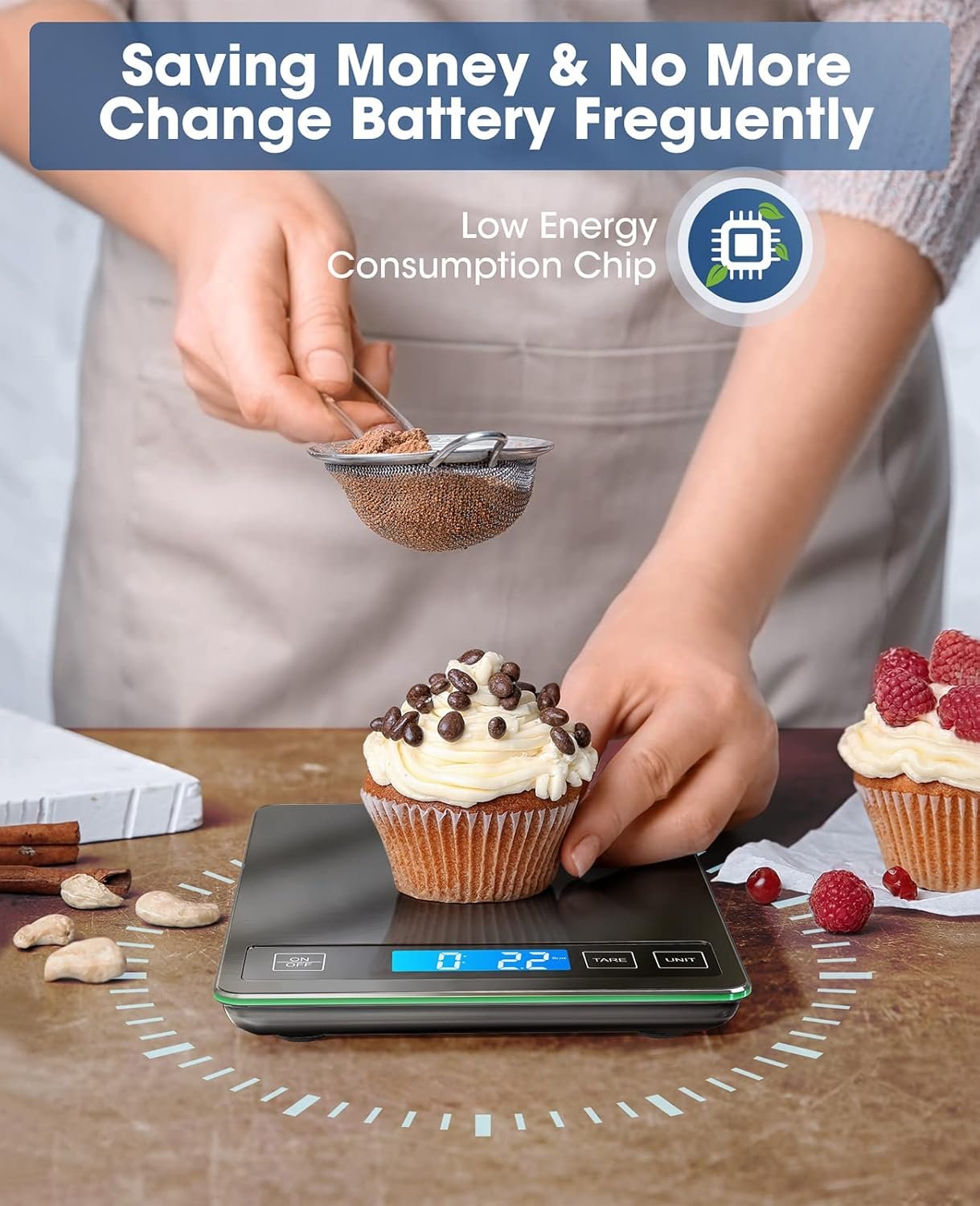 PRECISE WEIGHT: The digital food scale built-in four high-precision load sensors, quickly and accurately response 0.1oz or 1g increments when adding ingredients, its measuring range: 0.1oz to 22 lbs and 3g to 10kg(Min. weigh at 0.1oz or 3g)
