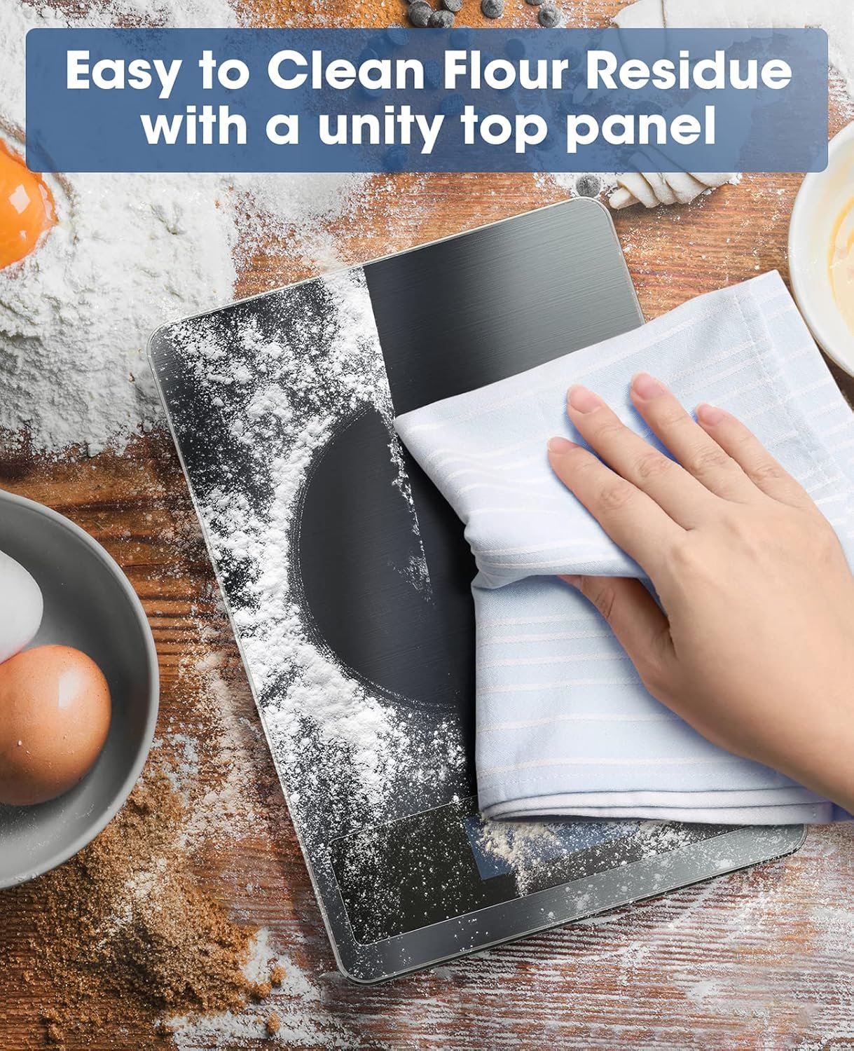 PRACTICAL DESIGN: The food scale is designed with tempered glass for strong bearing, sleek stainless steel top surface for anti-fingerprint and easy clean, with a attached hook for convenient storage