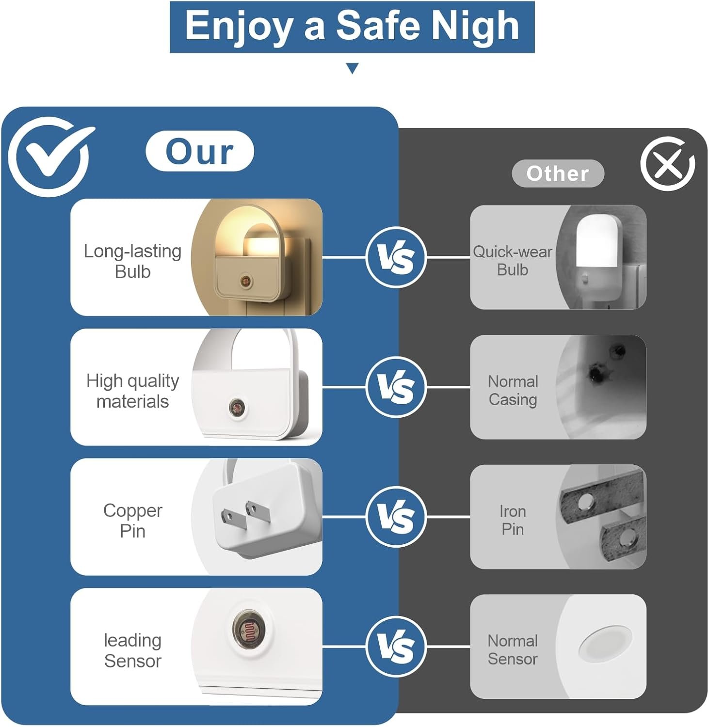ENERGY SAVING – The night light no bulb replacement, uses 4pcs just bright LED, 10hrs each day, Less than 20 cents cost for annual power consumption, Probably not even enough to make any movement of your power meter.