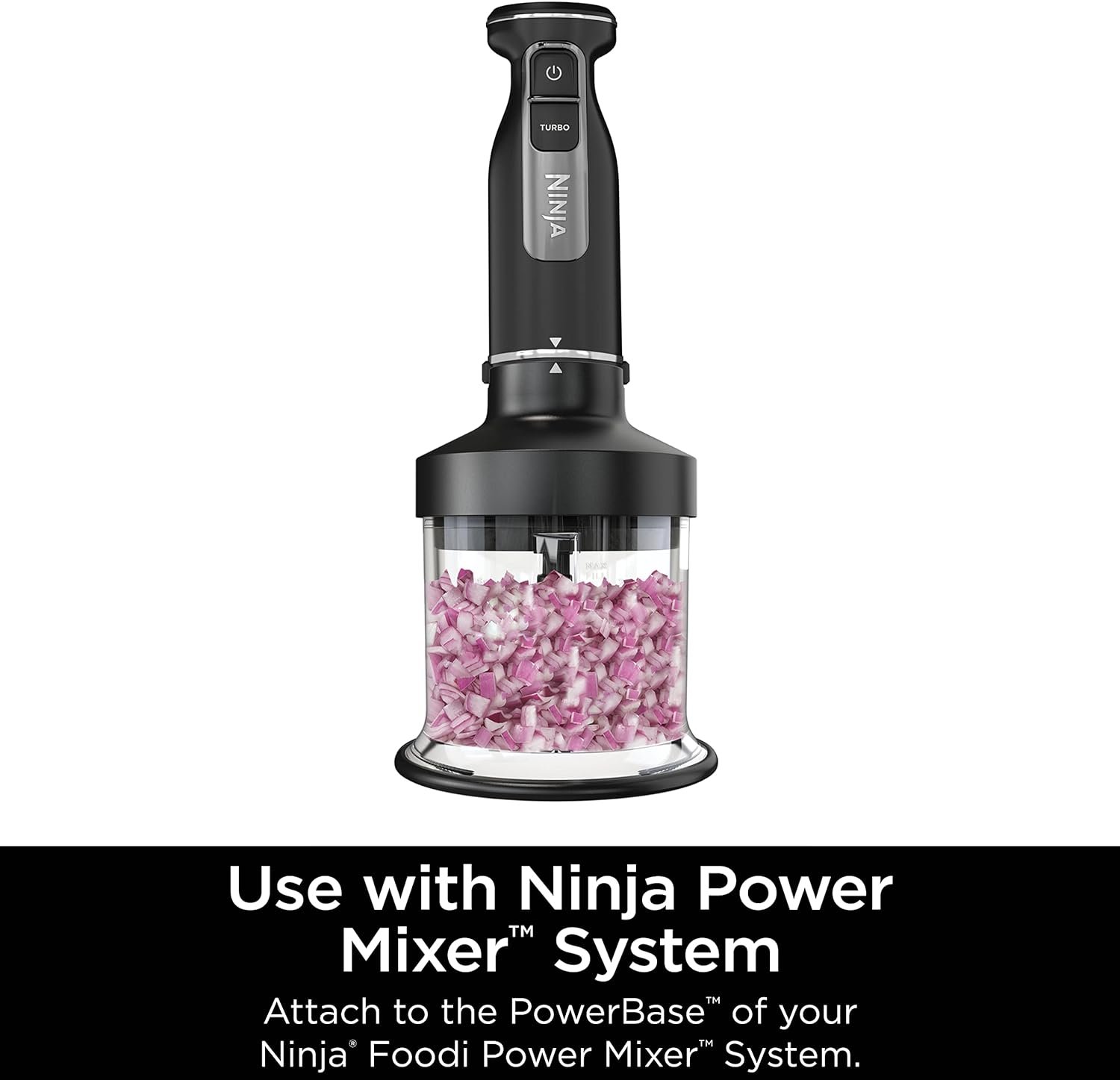 The Power Chopper attachment is compatible with the Ninja Foodi Power Mixer System. Includes a 3-Cup Chopper, stacked blade assembly, processing lid, and a storage lid. The Power Chopper attachment unlocks food processing capabilities such as chopping, mincing, and pureeing ingredients.