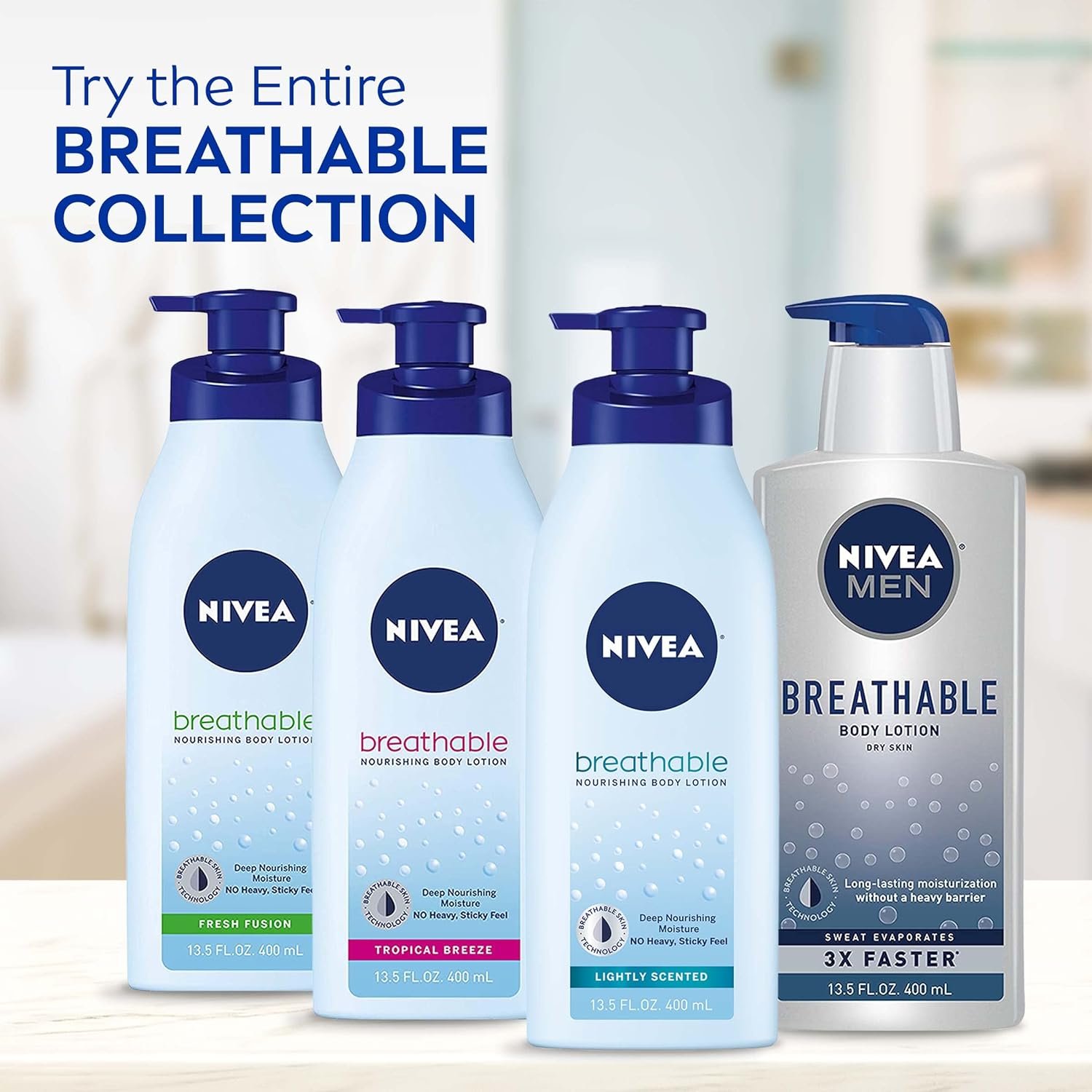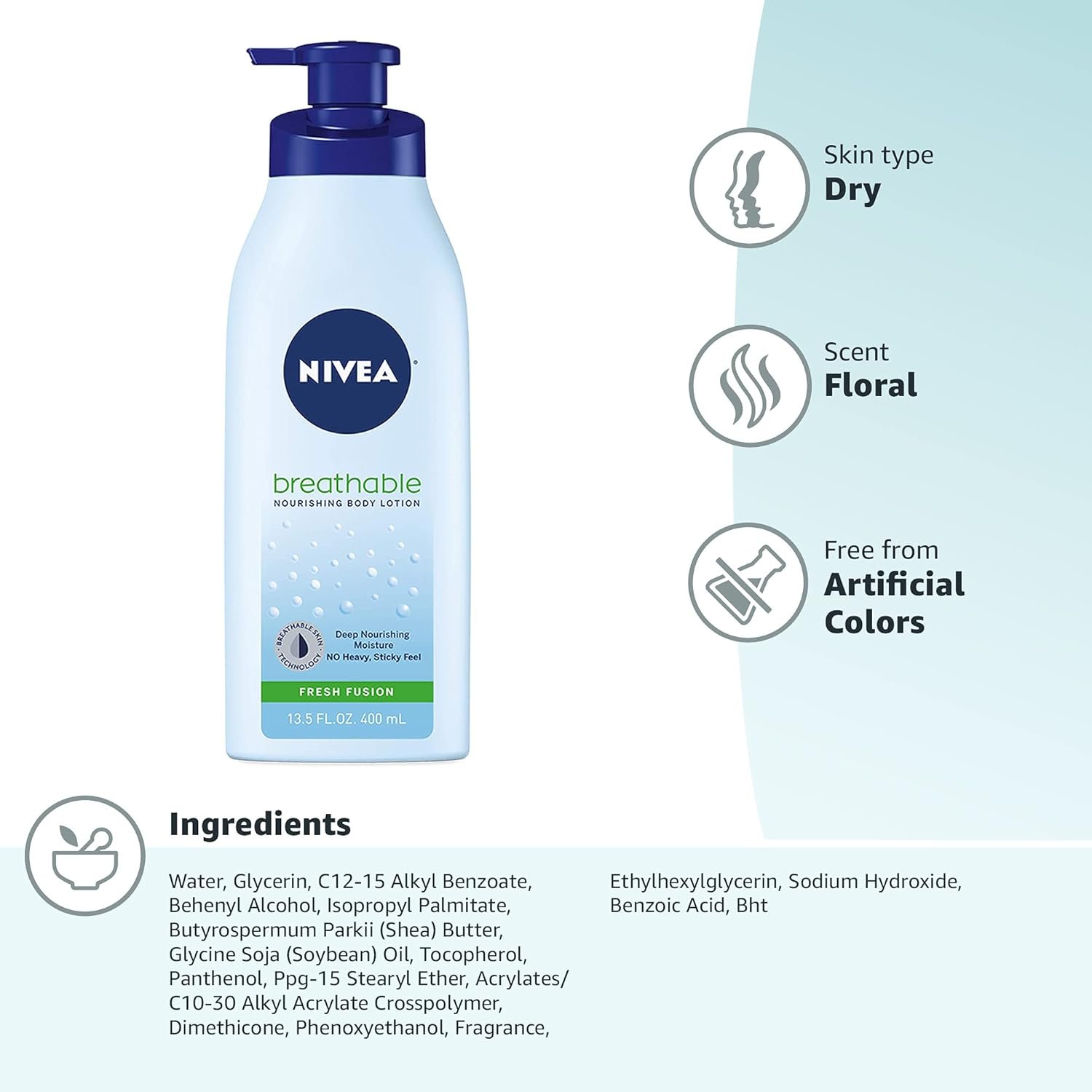 Includes one (1) 13.5 fluid ounce bottle of NIVEA Breathable Nourishing Body Lotion Fresh Fusion