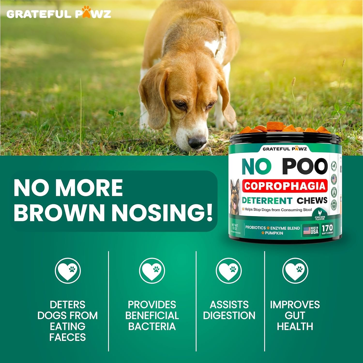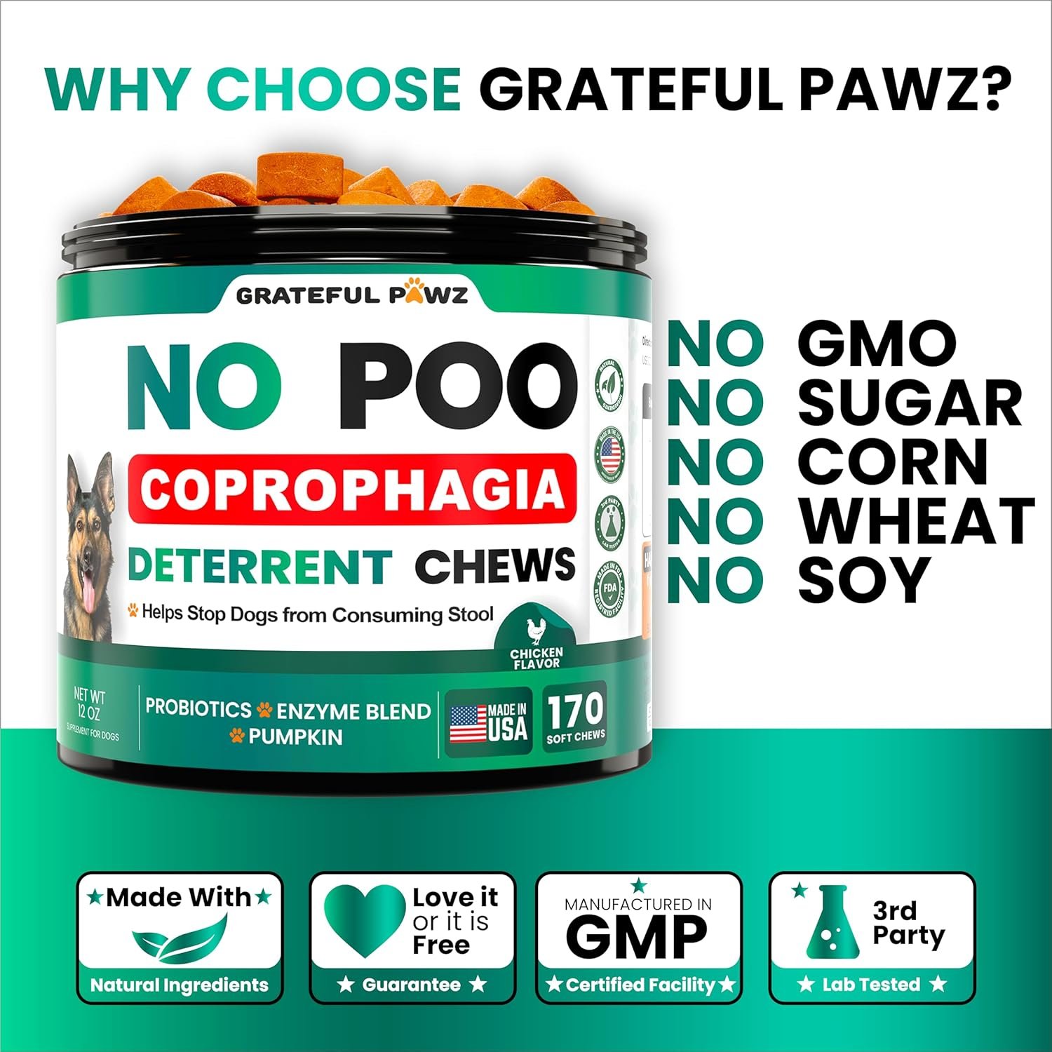 Unique Formula To Stop Dog Poo Eating – Our natural no poo chews supplement contains a Probiotic and Enzyme Blend to support healthy gut flora, immune system, and normal food digestion.
