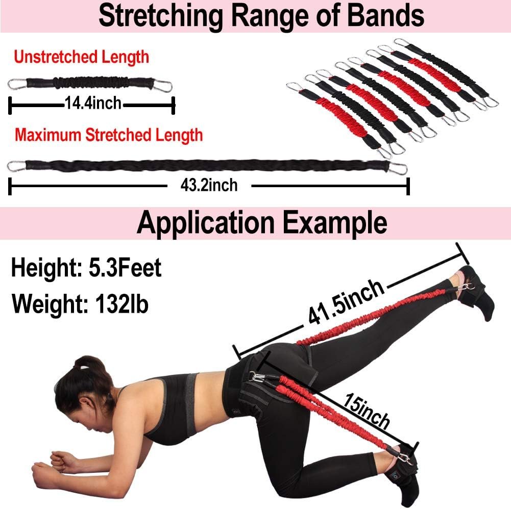 HOW TO CHOOSE RESISTANCE BANDS WITH DIFFERENT LEVELS – According to your height, choose a application suits you at first. Then choose the proper band to achieve the different resistance level. Such as you can get 30lbs for each leg when you choose 2 red bands for each leg, 50lbs for each leg when you choose 2 black bands for each leg.