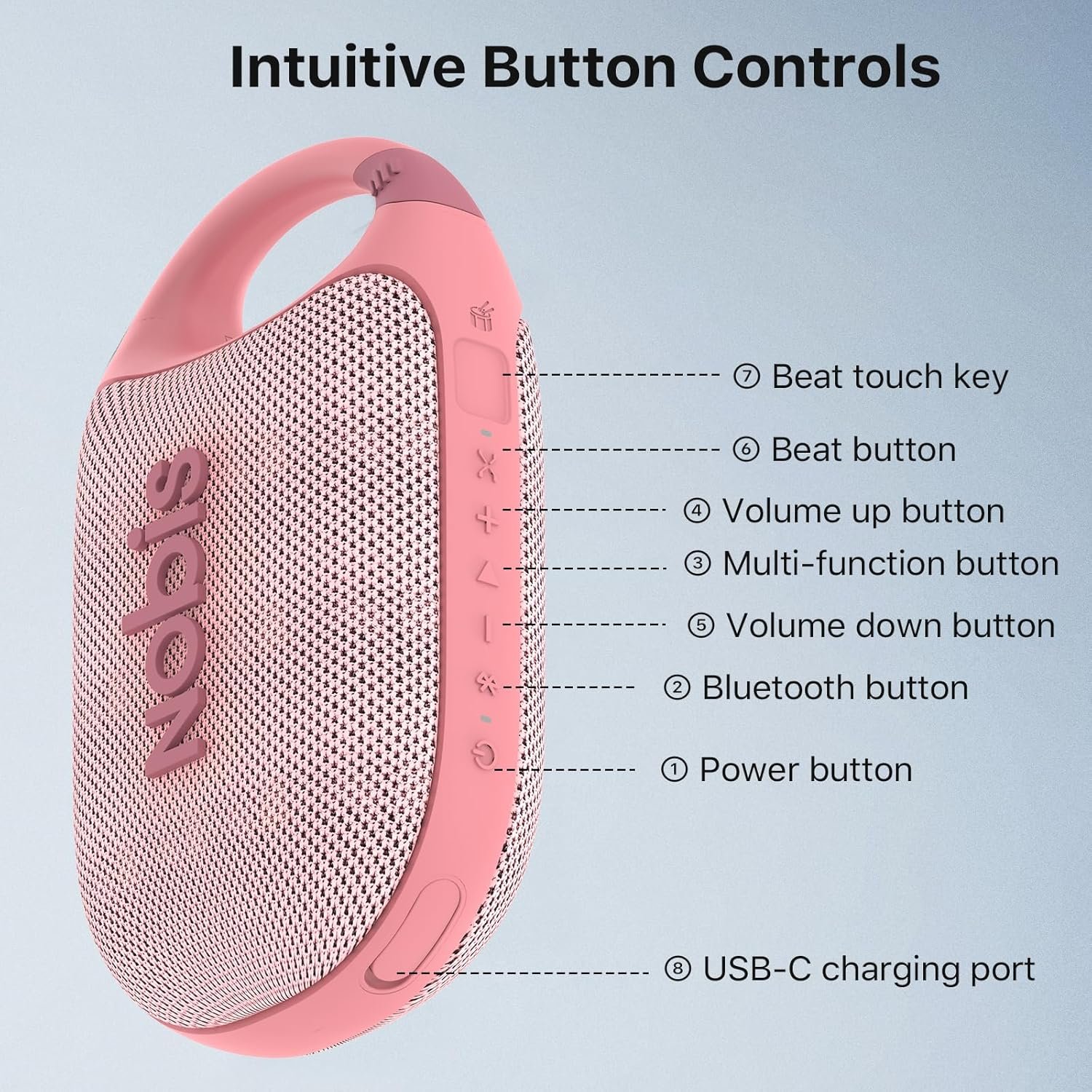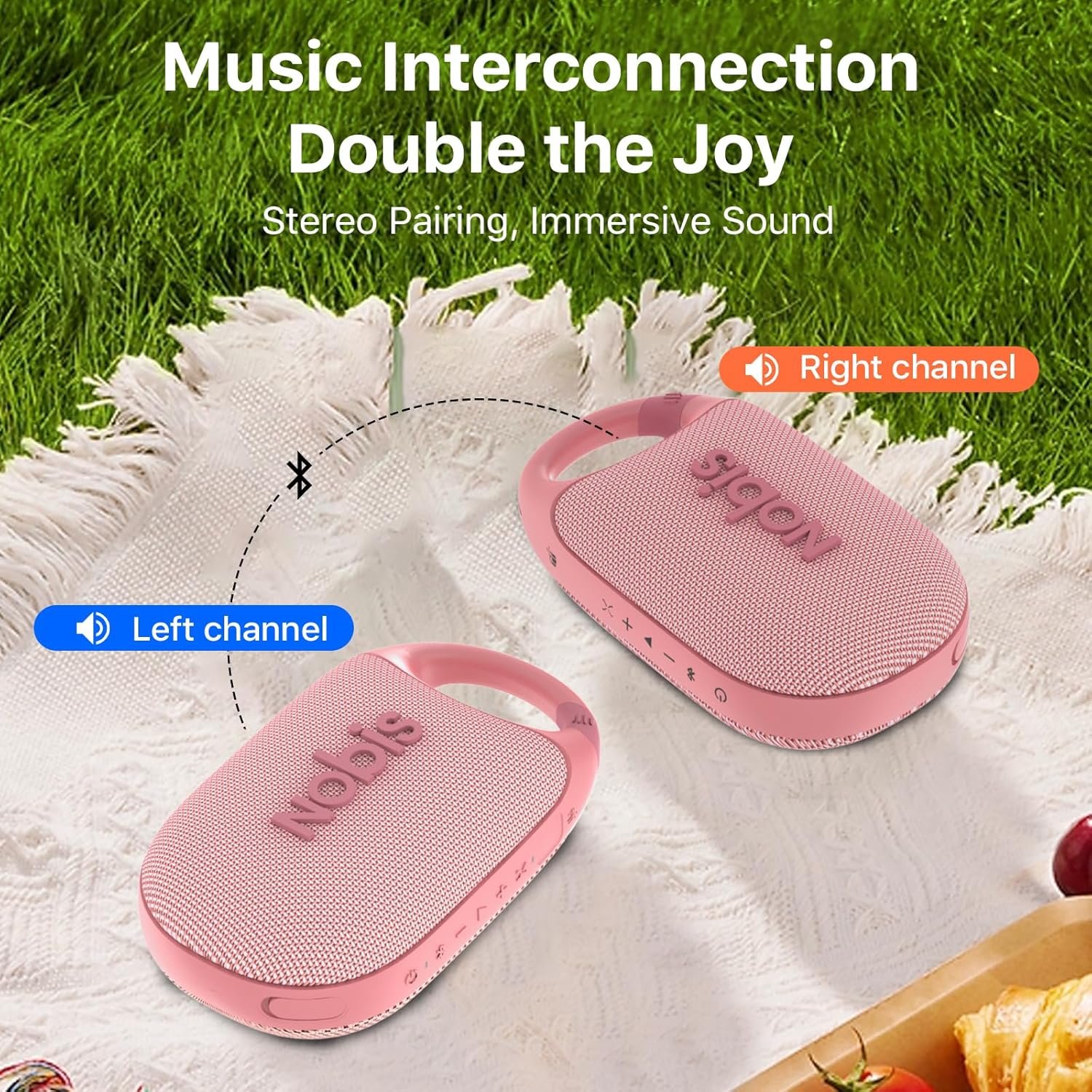 NOBIS Clip N1 Portable Bluetooth Speaker with App, Beat Mode, Up to 24H Playtime, IP68 Waterproof, BT 5.3, HD Sound, Stereo Pairing, Custom EQ, Perfect for Outdoor, Home and Adventure (Pink)
