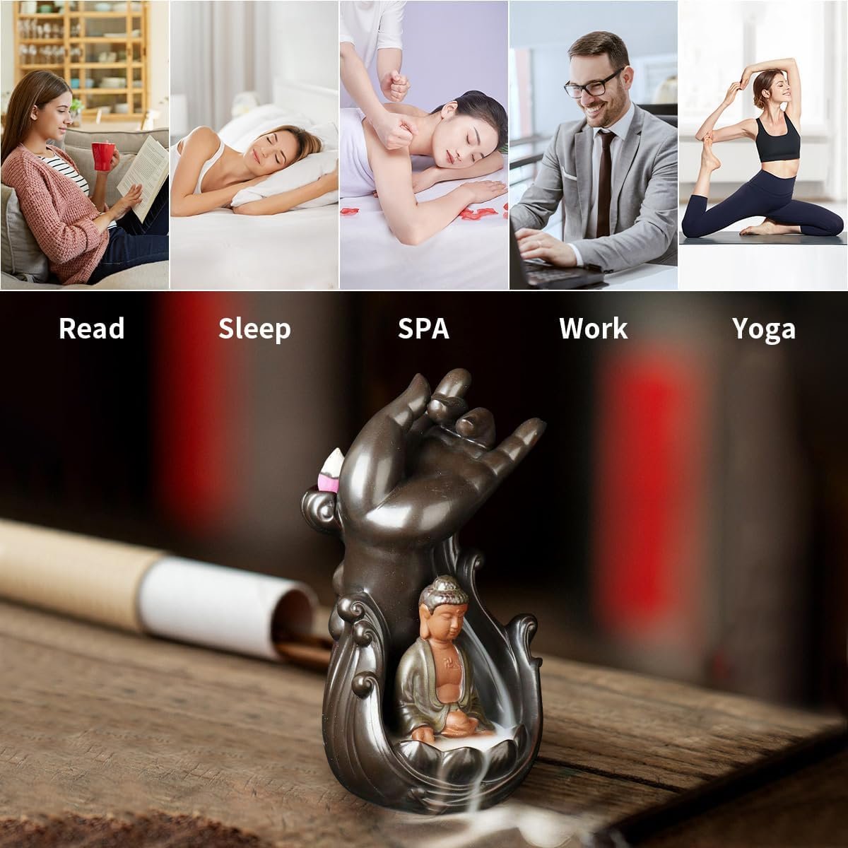 【Versatile and Multi-Functional】This Buddha incense holder is not only a beautiful decorative piece but also a functional item. It can be used with both incense cones and incense sticks, allowing you to fill any room with your favorite fragrance. Whether you want to relax, clear your mind, or simply add a pleasant aroma to your living space, this incense burner is the perfect choice.