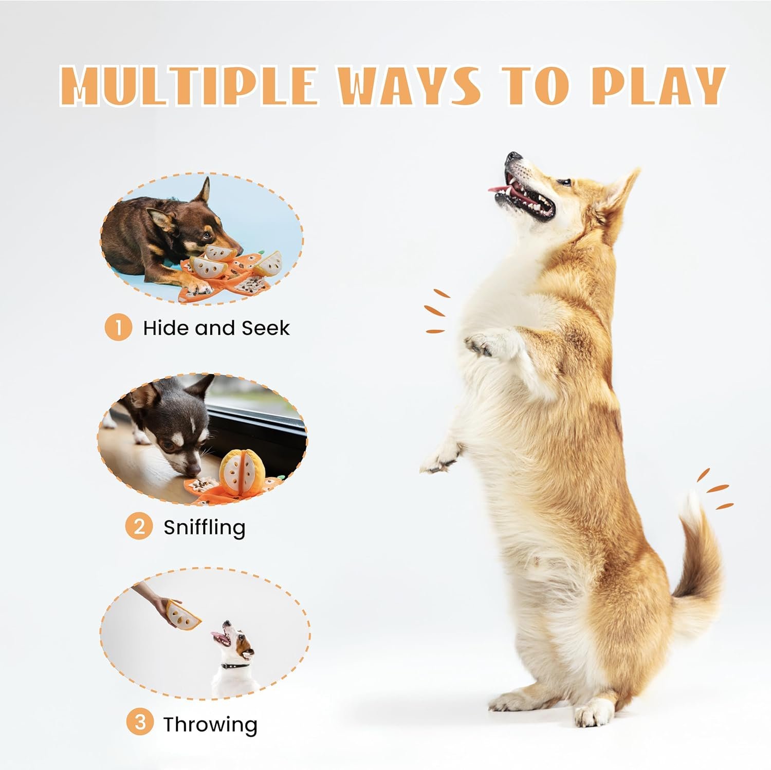 Promote Health: Foster bonding and playtime with our dog digging toys! Beyond mere entertainment and chewing, these dog squeak toys offer the ability to toss the tangerine meat toys to entice your pet. This promotes active movement, helping your pet excess energy and steering clear of furniture damage.