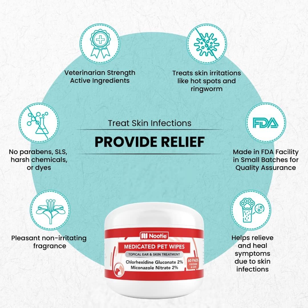 Nootie Medicated Pet Wipes – These medicated pads for dogs and cats are ideal for treating symptoms of ringworm, hotspots, allergy dermatitis, and ear and skin infections. These medicated cat and dog wipes contain the following ingredients: Active Ingredients: Chlorhexidine Gluconate 2% and Miconazole Nitrate 2%; Inactive Ingredients: Purified Water, Propylene Glycol, Peg 5 Cocamide, Polyethylene Glycol 600, Benzyl Alcohol, and Fragrance. Our pet wipes are 2″ in size – perfect to use on hard to reach areas. These medicated wipes for pets come in a pack of 70. The wipes are free of parabens, SLS, harsh chemicals, or dyes. Sold in over 10,000 Vet Clinics & Pet Stores Worldwide.