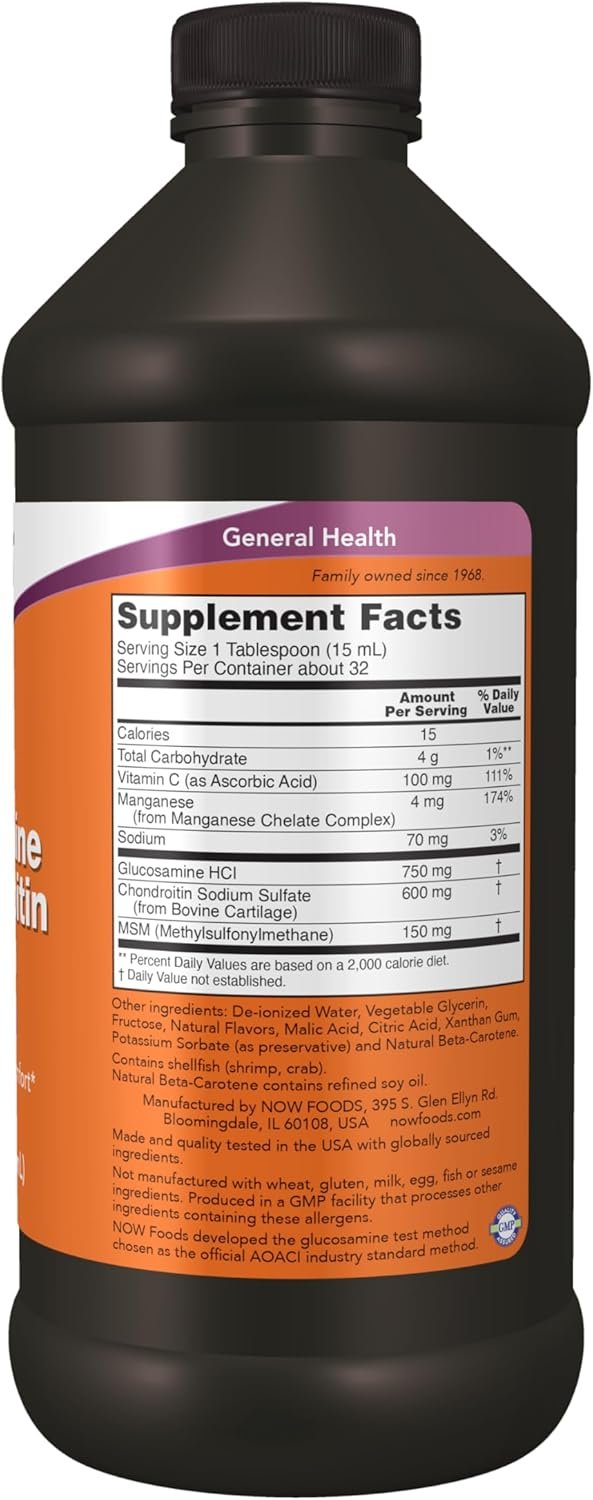 NOW Liquid Glucosamine & Chondroitin with MSM combines three of the best known nutrients available for the support of healthy joints in a convenient liquid form. Scientific studies have demonstrated that Glucosamine and Chondroitin can promote normal joint mobility and comfort. MSM is present as a naturally occurring sulfur compound and Manganese and Vitamin C have been included as complementary ingredients to provide optimal nutritional support for the production of healthy joint structures. NOW Foods developed the glucosamine test method chosen as the official AOACI industry standard method. Natural color variation may occur in this product.