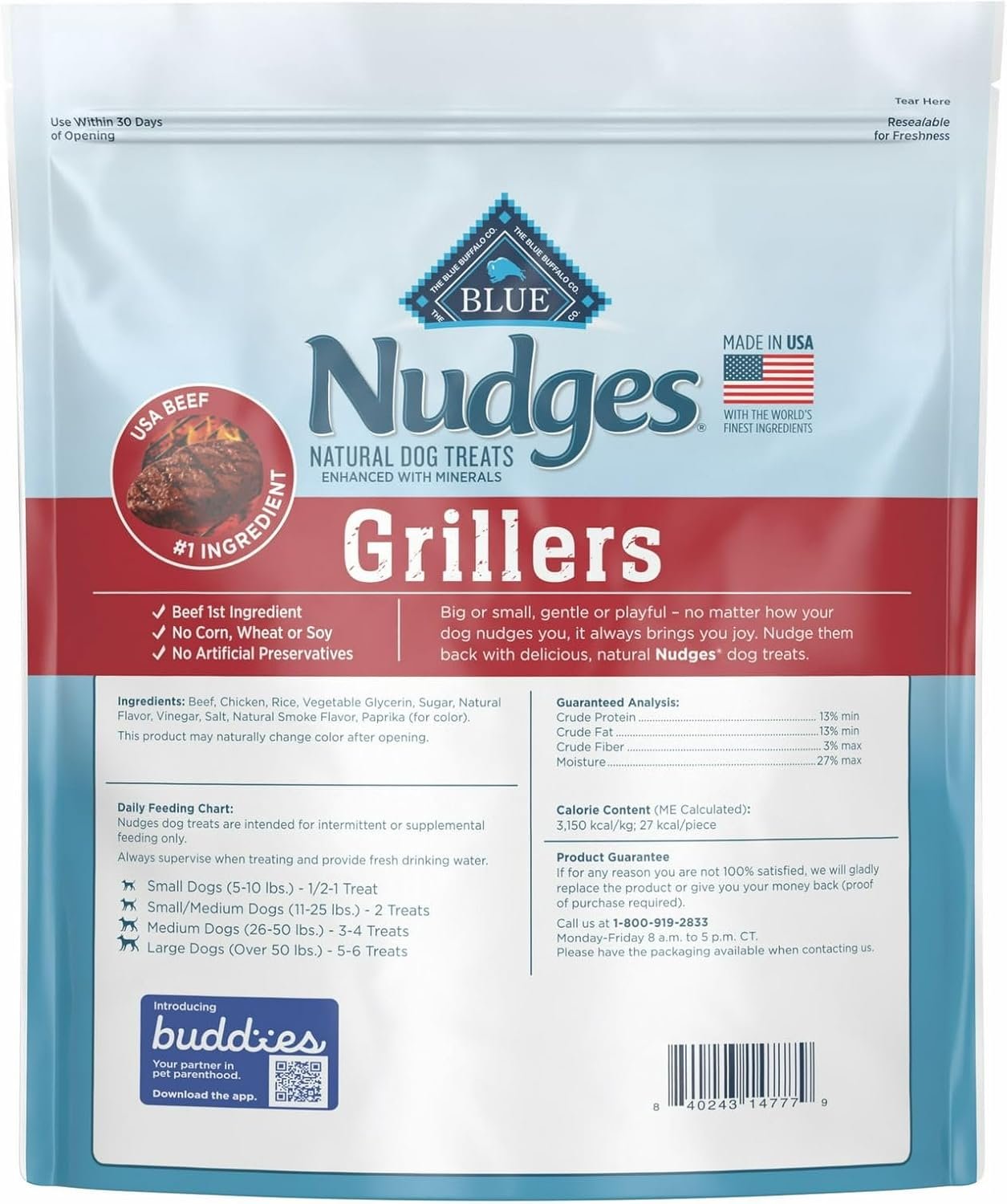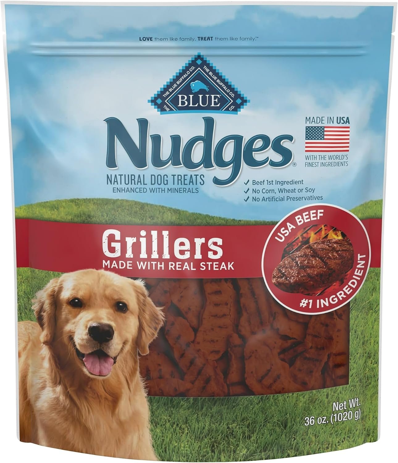 Satisfy your buddy’s cravings for summer grilling all year long with Nudges Grillers, featuring a tantalizing taste and texture inspired by perfectly grilled favorites. Made with real meat as the first ingredient, these tender dog treats bring the joy of a warm summerâ s day anytime. Nudges are brought to you by , the leader in natural pet food. Love them like family. Treat them like familyNEW TO: Nudges are now part of the family; Same great taste and healthy ingredients, now backed by the True PromiseREAL STEAK FIRST: Nudges Grillers are made with delicious real steak as the first ingredient for an irresistible flavorTAIL-WAGGING TEXTURE: Dogs will dig the tender and deliciously charred texture of these healthy dog treatsWHOLESOME INGREDIENTS: foods and treats are formulated with the finest natural ingredients, with no chicken by-product meals, no corn, wheat or soy, and no artificial flavors or preservativesPACKAGING MAY VARY: Contains one 36oz bag of Nudges Grillers Natural Dog Treats, SteakBOX TOPS: is a proud partner of Box Tops. Download the Box Tops app, scan your receipt, and start earning for schools in need today!