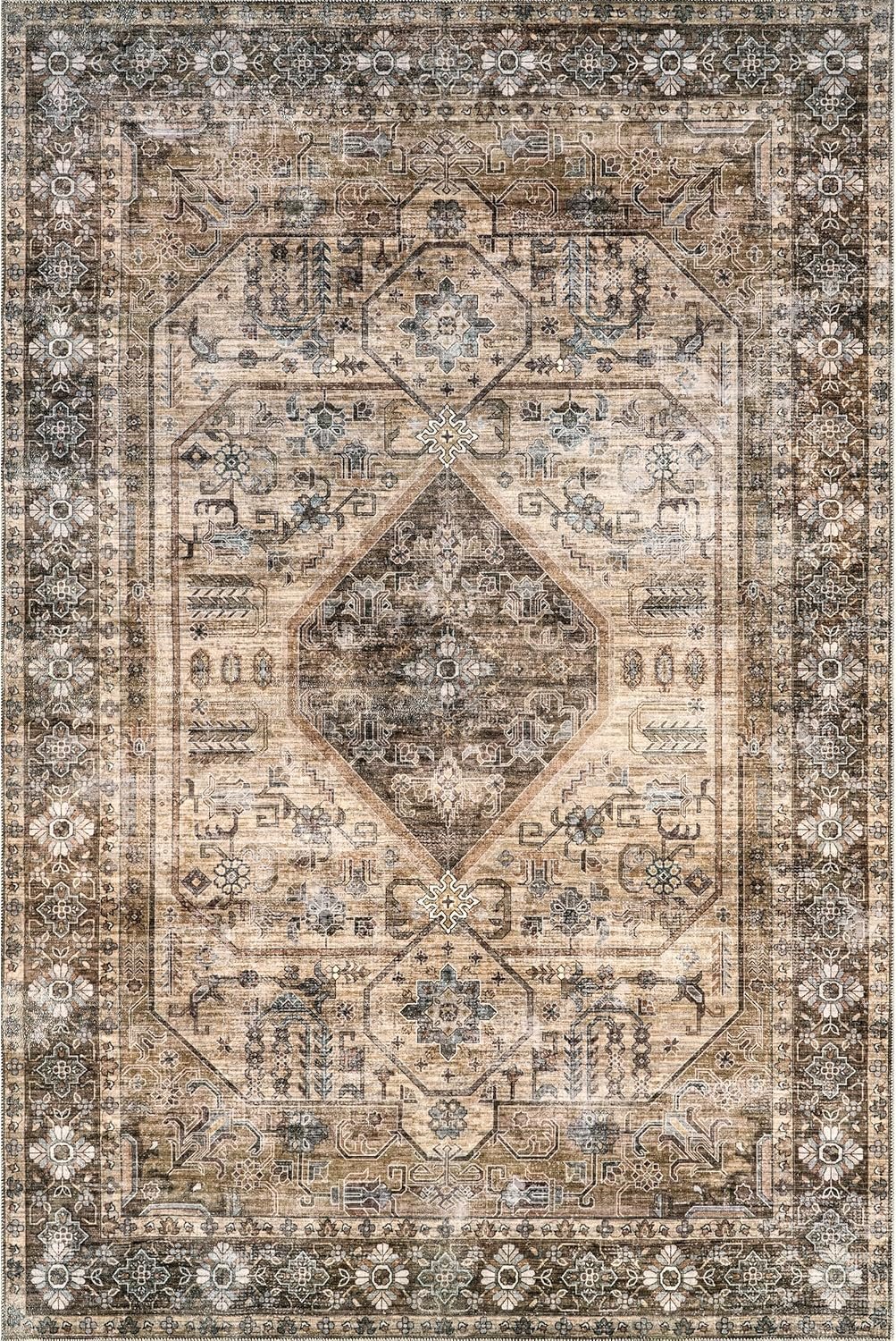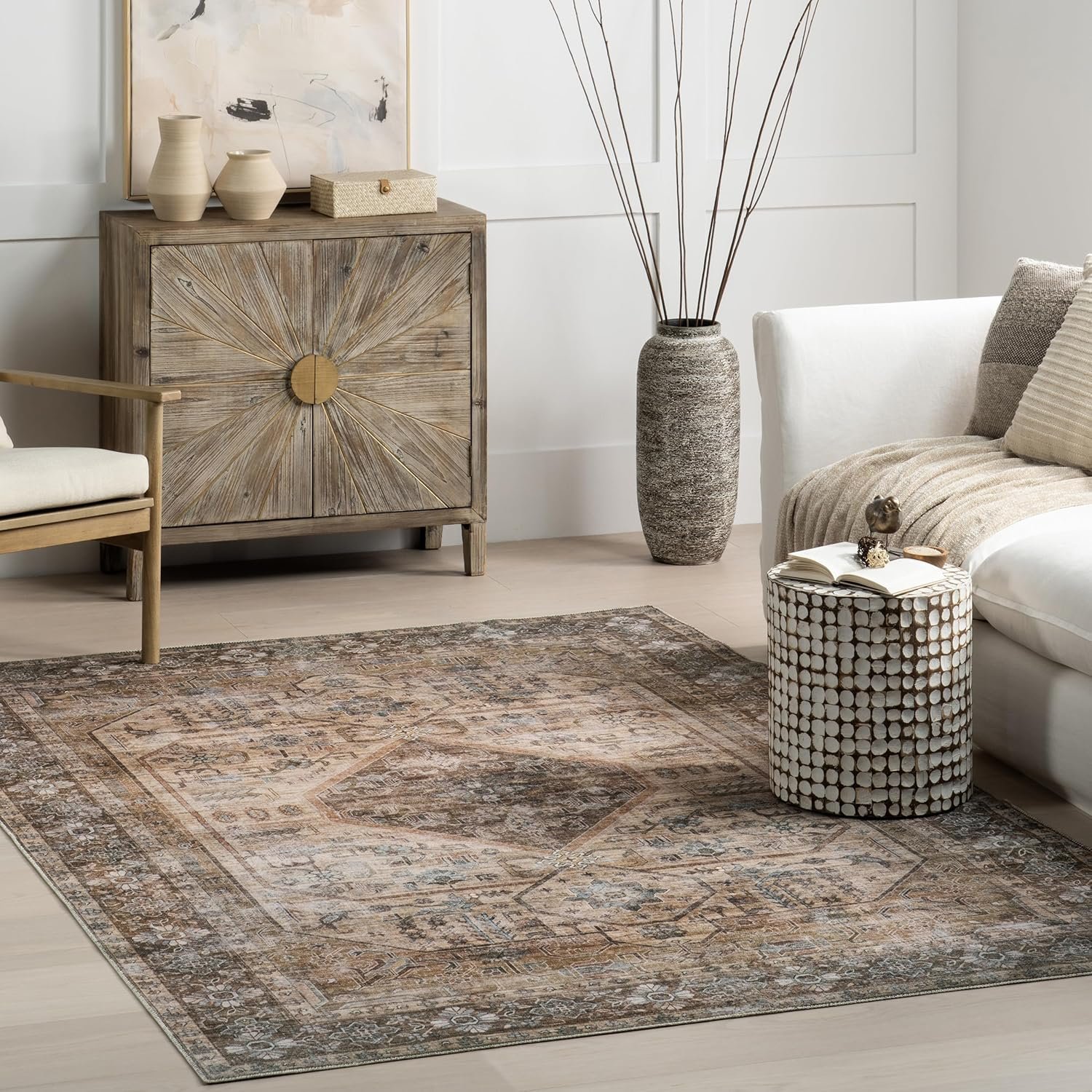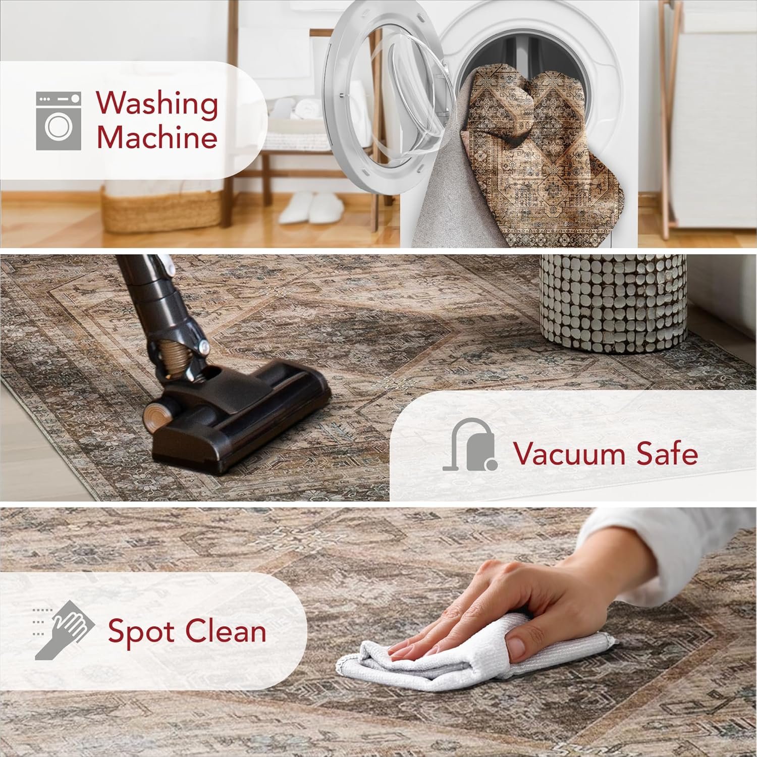 Stain-Resistant Material: Our machine washable rugs are crafted from synthetic materials that are stain-resistant, lightweight, and easy to clean. The stain-resistant properties ensure that the rug maintains its vibrant colors and patterns, even after enduring the demands of everyday use. If your rug is located in an area that receives direct sunlight, regularly rotate your rug to maintain its appearance.