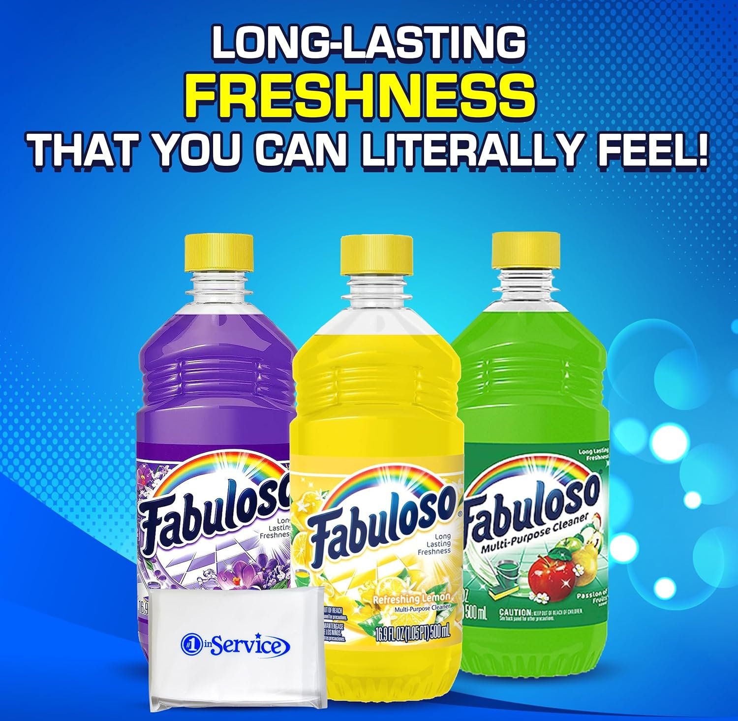 Includes – Comes with 3 fabuloos 16 ounce floor cleaner, lavender, passion fruit, and lemon, and Number 1 in Service Wallet Size Tissue Pack