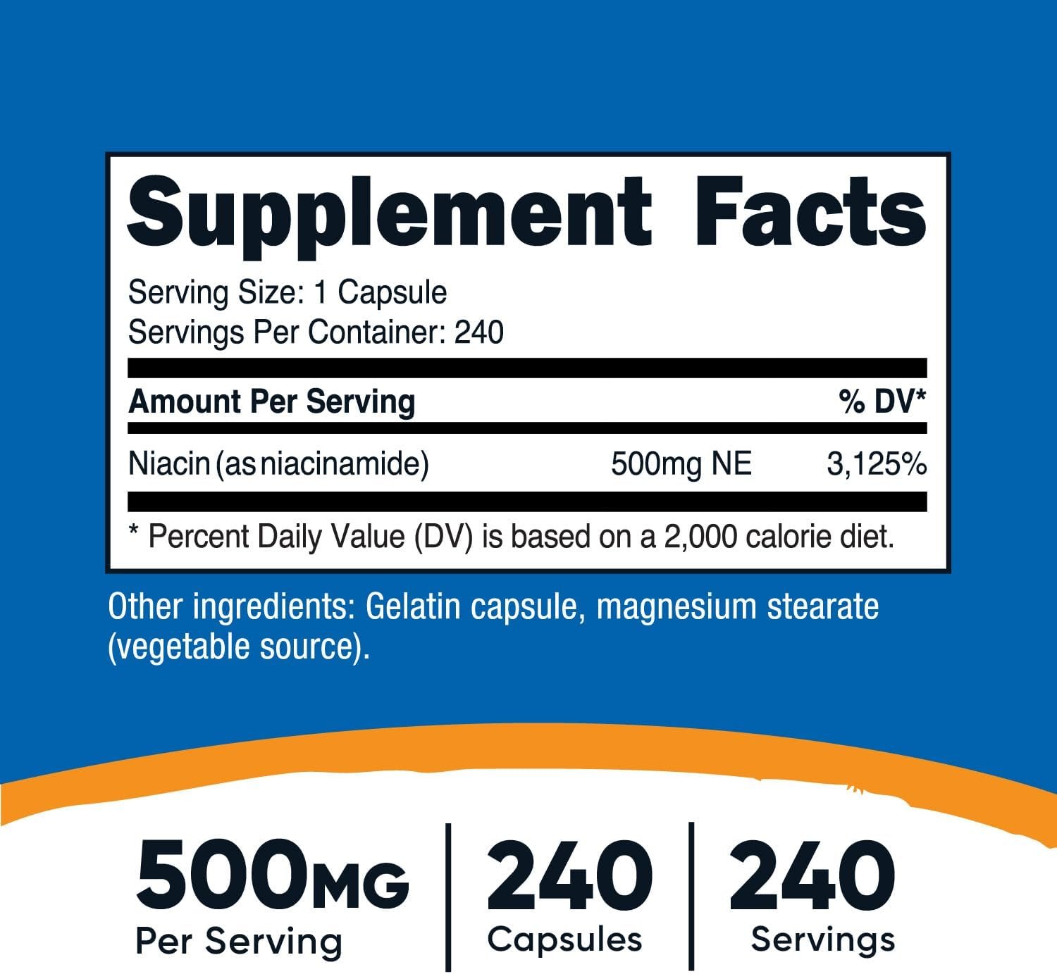 Potent & High Quality Niacinamide (Vitamin B3) Made in a GMP Compliant Facility 500mg of Niacinamide Per Capsule. 240 Servings Per Bottle 240 Capsules Per Bottle