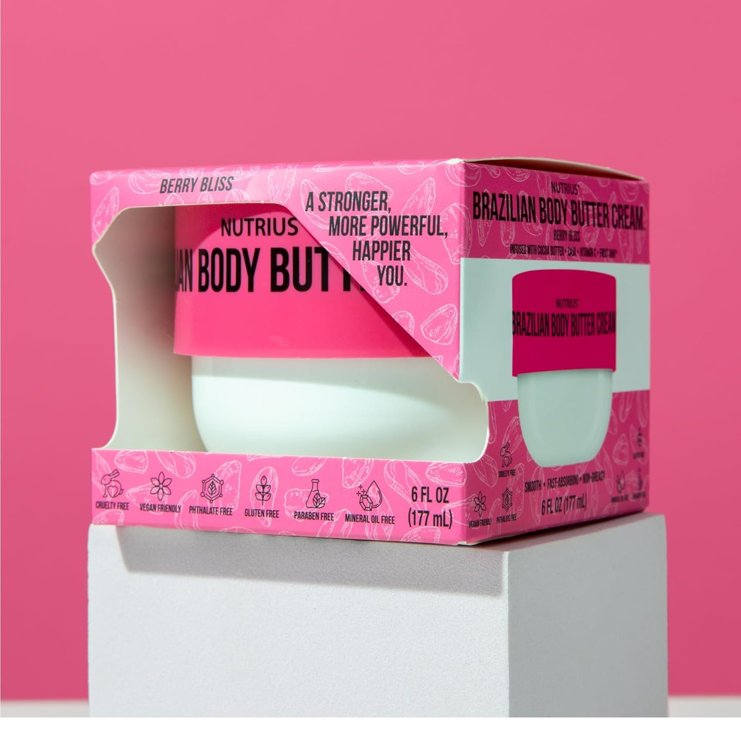 💧 Crafted with a vegan and cruelty-free formula, Nutrius Brazilian Body Butter Cream Berry Bliss upholds ethical and sustainable skincare practices.