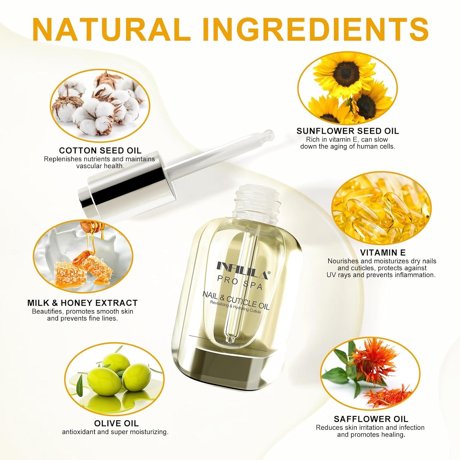 NATURAL INGREDIENTS: NXJ INFILILA new cuticle oil is enriched with a variety of natural nutritious and healthy ingredients such as sunflower oil, safflower oil, cottonseed oil, olive oil, vitamin E, honey, and milk extracts to care for your skin and nails.