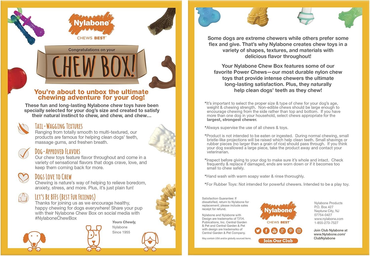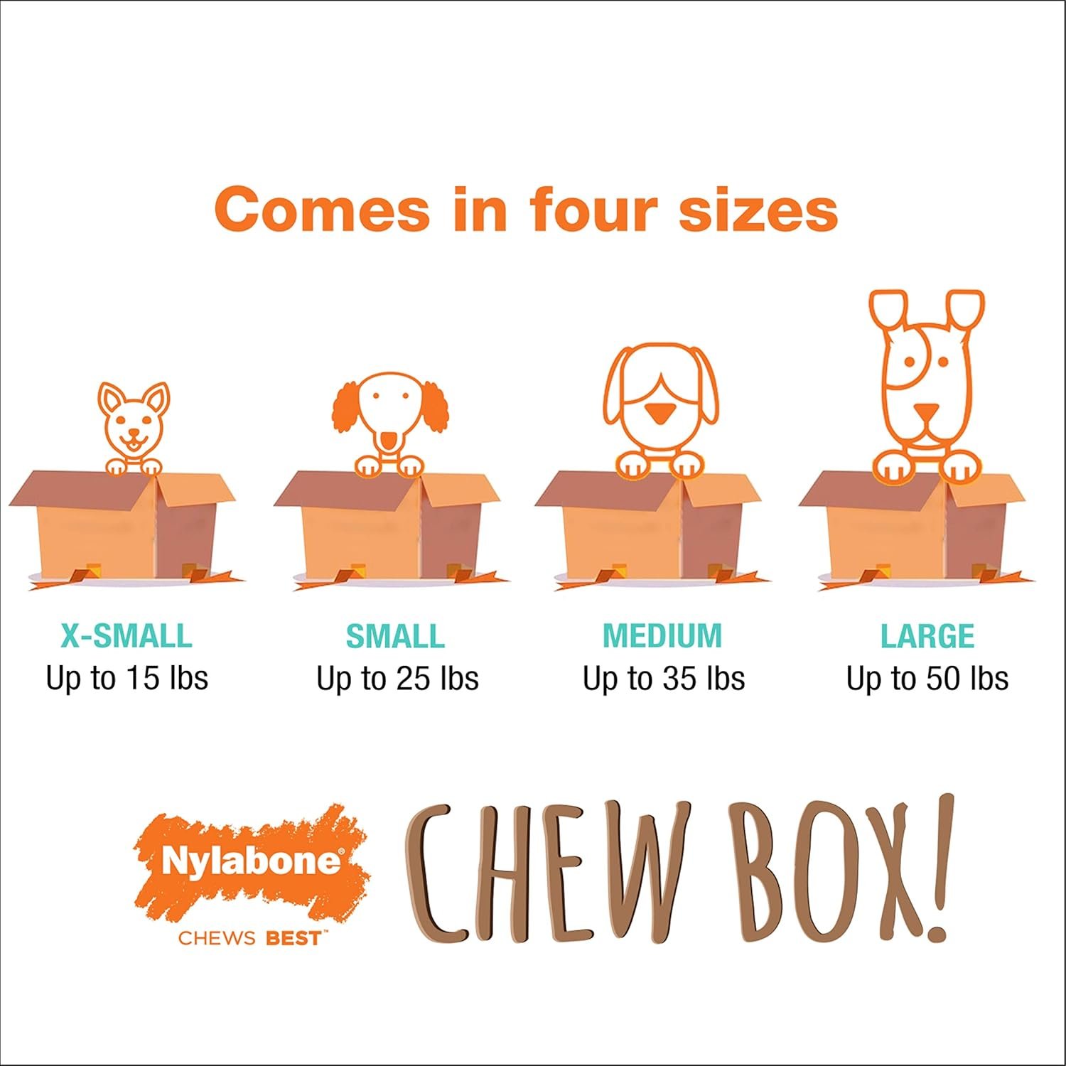 Reward your dog with a chewing adventure crafted just for them with the Nylabone Chews Best Box! This chew toy box for dogs surprises your furry friend to 4 exciting Nylabone chew toys that were carefully selected for your dog’s size and expertly designed to keep them busy and happy. Open this dog chew toy box and you will discover chew toys in different shapes, exciting colors, engaging textures, and dog-approved flavors. No matter which chew toy your dog chooses first, it is sure to satisfy their natural instincts and provide a safe activity that’s just plain fun! Plus, each chew toy is made of durable materials that will challenge dogs while helping to clean teeth and freshen breath. The Nylabone Chews Best Box’s unique combination of features and benefits makes it the perfect gift for the chewers in your life!