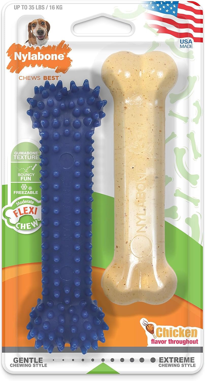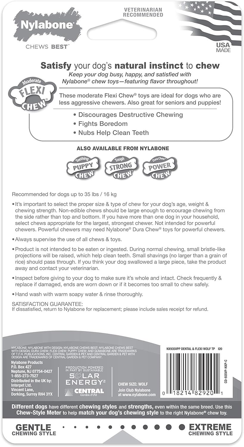 Our Dental Chew and Moderate Chew FlexiChew Twin Pack is designed for moderate chewers who prefer a gentler chewing experience. The Moderate Chew FlexiChew toy keeps dogs entertained with delicious chicken flavor throughout. The Dental Chew has gentle, rounded dental nubs that help clean teeth and massage gums. The bristles raised during chewing both of these bones help clean teeth and control plaque and tartar buildup. (Not recommended for strong chewers.) Go ahead and give your dog a Nylabone! Made in the USA!