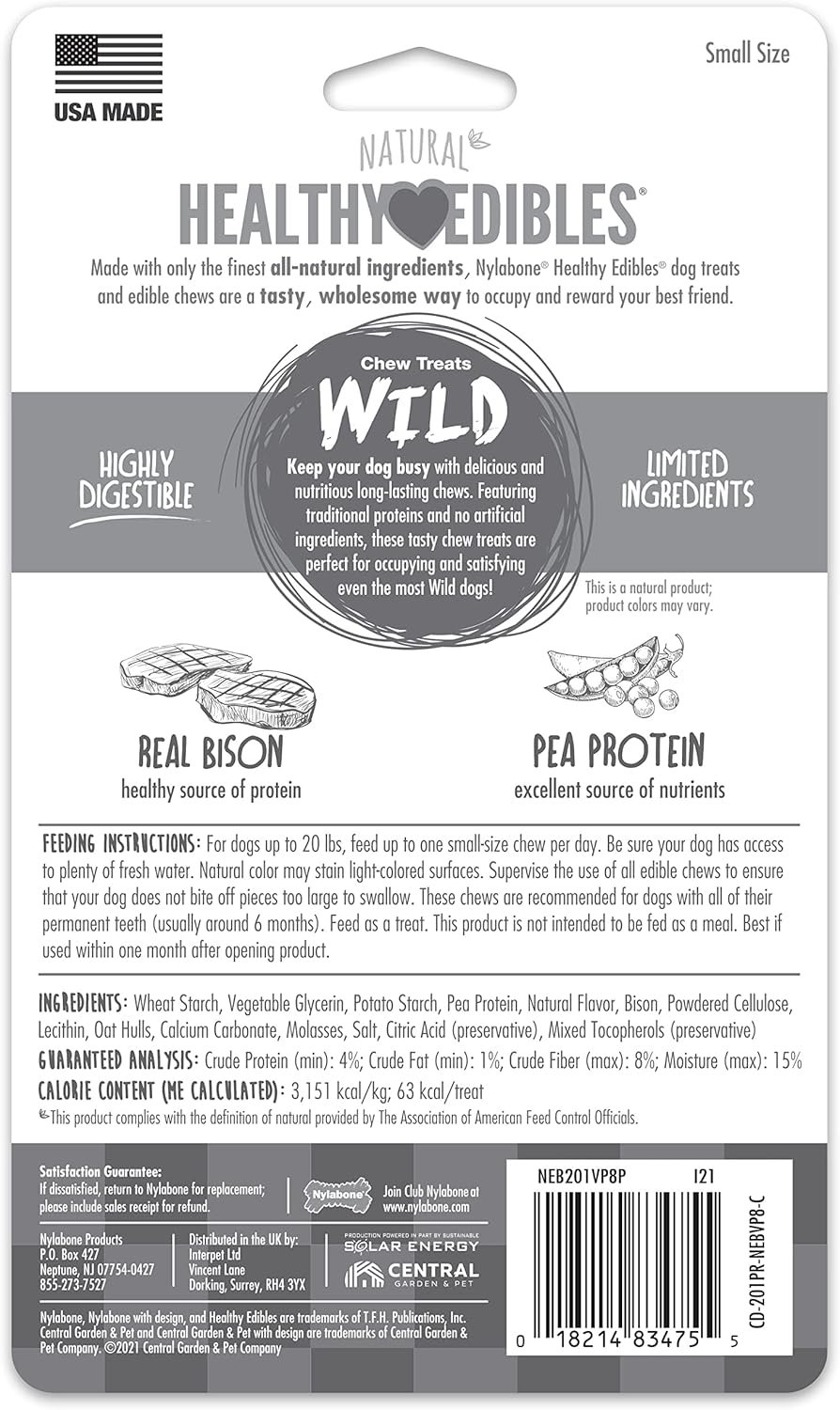 ABOUT HEALTHY EDIBLES Reward and occupy your best friend with Healthy Edibles dog treats! Made with no artificial colors, flavors, or preservatives, these natural dog treats come in many delicious flavors, engaging shapes, and sizes for every dog—even puppies! DOGS GO WILD FOR REAL BISON These tasty dog chew treats resemble real bones and contain delicious bison flavor to indulge your furry friend’s wild side. They’re also made with a highly digestible, limited-ingredient formula featuring protein for an excellent source of nutrients. Whether you want to keep your dog occupied or just reward them with a savory treat, these long-lasting dog chews will keep them satisfied! GUARANTEED YOUR DOG WILL LOVE IT Before we introduce new dog products to furry friends and pet parents everywhere, we make sure our very own dogs love them first! If you’re not happy with your Nylabone chew treat for any reason, simply return it to us with the sales receipt for your money back. Or, reach out to our Consumer Care team so we can help make it right (and talk about how much we also love our dogs). MEET NYLABONE Ever since introducing our very first chew toy in 1955, Nylabone has been helping pet parents take the best possible care of their furry friends. Fast-forward 60+ years and our family-founded company is still trusted for tasty treats, high-quality chew toys, fun play toys, and easy-to-use dental products!