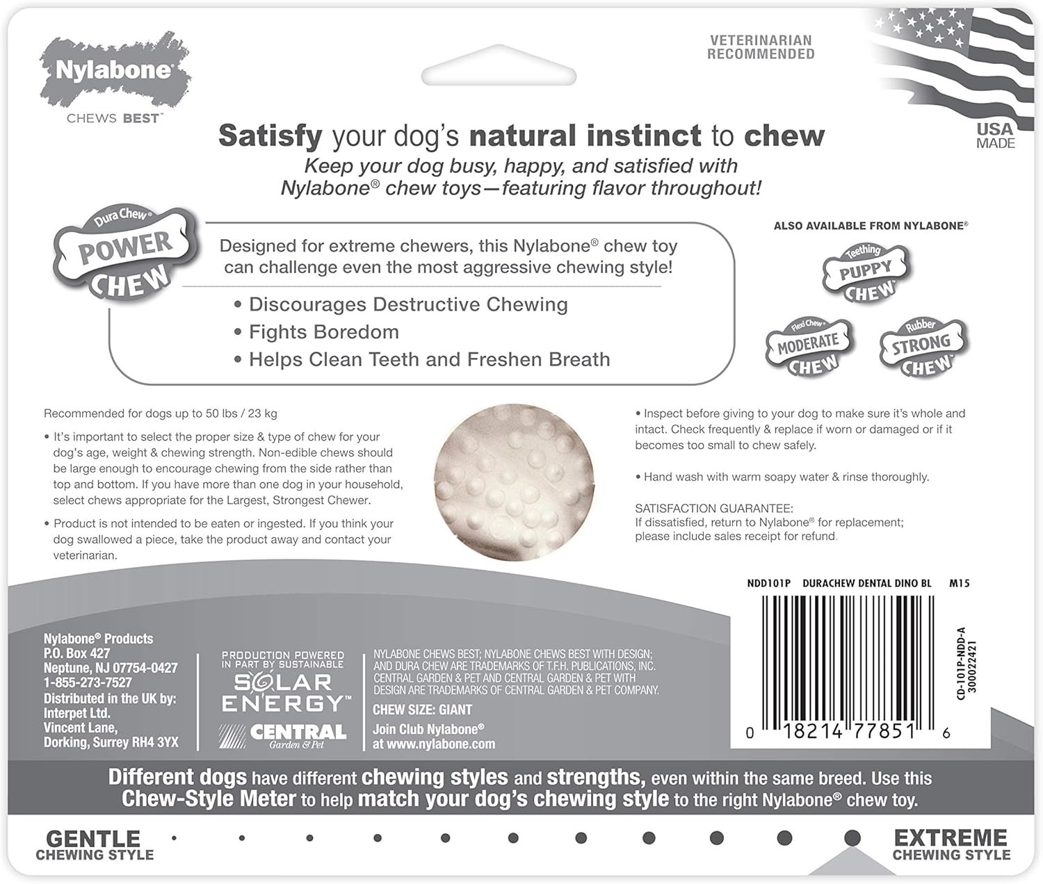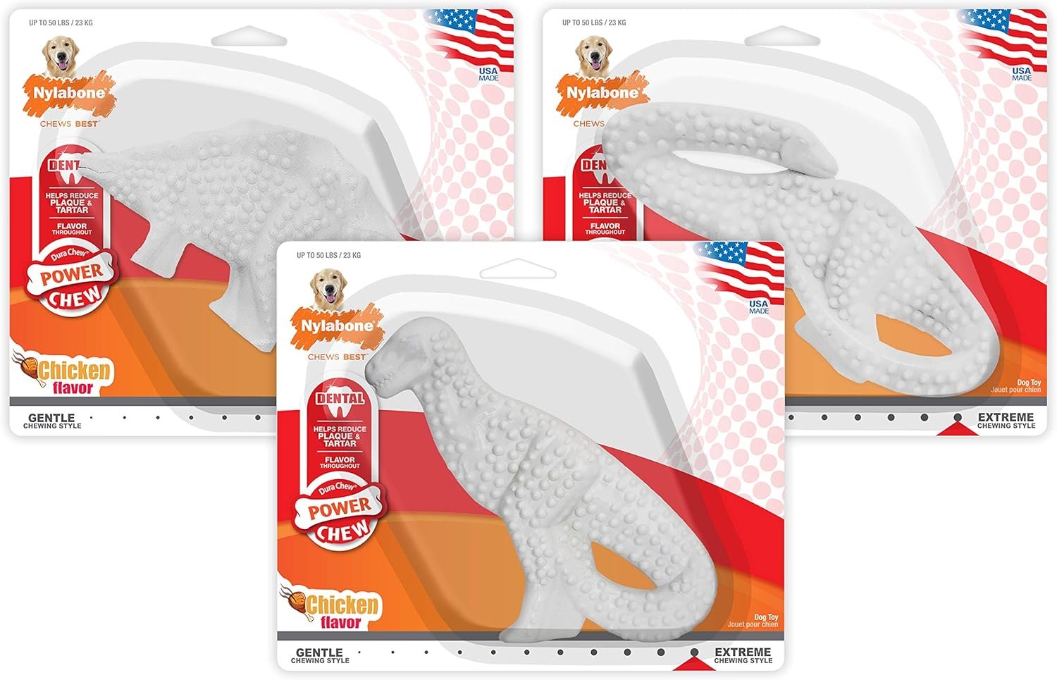Powerful chewers need powerful chew toys! Our Power Chew Dental Dinosaur satisfies your dog’s prehistoric urge to chew with irresistible chicken flavor throughout. This dog dental chew toy features gently rounded nubs and bristles that raise during chewing. They promote clean teeth, help control plaque and tartar buildup, massage gums, and freshen breath. Made of tough, durable nylon, this long-lasting chew will stand up to even the most aggressive chewers. Your dog will stay occupied with this toy for hours, helping to discourage destructive chewing. This dinosaur dog toy comes in three different dinosaur shapes: Brontosaurus, Stegosaurus, and T-Rex. Reward your dog with this din-o-mite veterinarian-recommended chew toy!