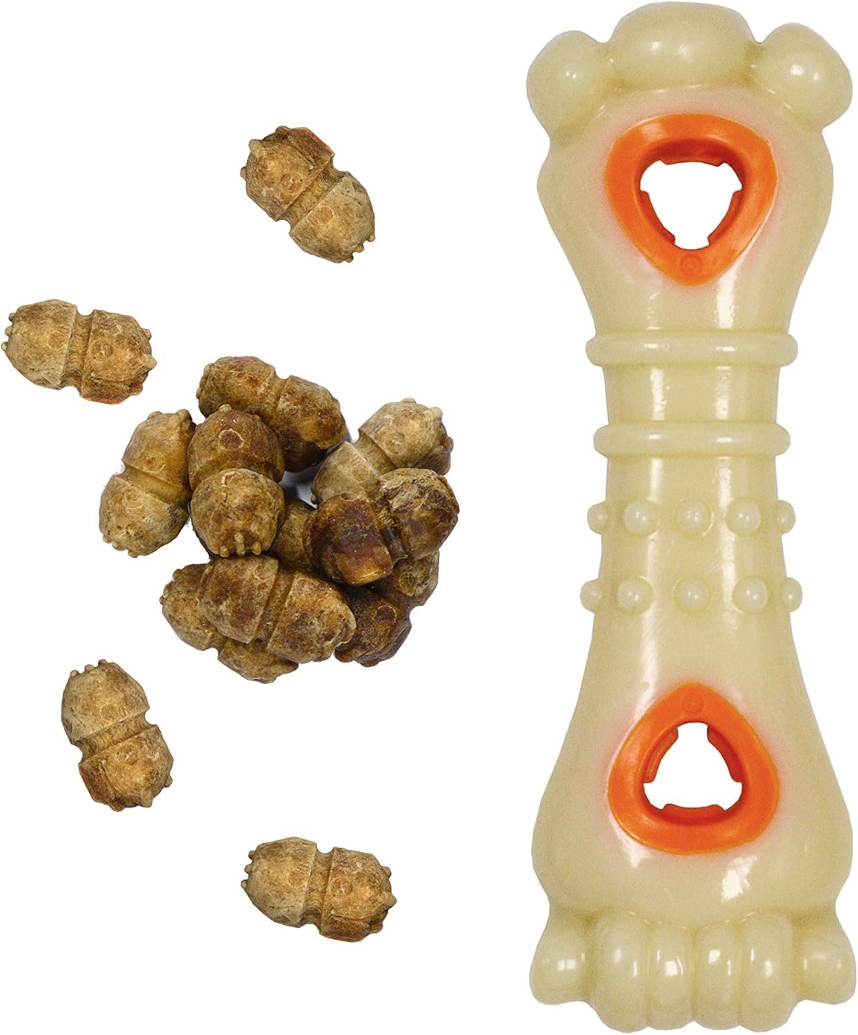 Give your dog the ultimate chewing challenge with the Power Chew Knuckle Bone Combo! Made of sturdy nylon, this long-lasting combo toy stands up to the most aggressive chewers and takes their Nylabone to the next level! Add All-Natural Pop-In Treats to this refillable dog toy for treat and chew time that lasts longer and tastes more delicious! These easy-to-load chicken dog treats securely fit in the chew toy and allow your dog to enjoy each treat from both sides. Small in size and big in flavor, the treats are highly digestible, contain limited ingredients, and are proudly made in the USA. Adding to the enjoyment, the knuckle bone chew toy contains delicious chicken flavor throughout and will satisfy your dog’s natural urge to chew. Plus, it features nubs and ridges that help clean teeth and freshen breath through chewing action. Whether you want to challenge your furry friend or simply reward them for being a good dog, this treat chew toy combo will keep them happy, busy, and satisfied. It’s a new and exciting way for dogs to enjoy their Nylabone!