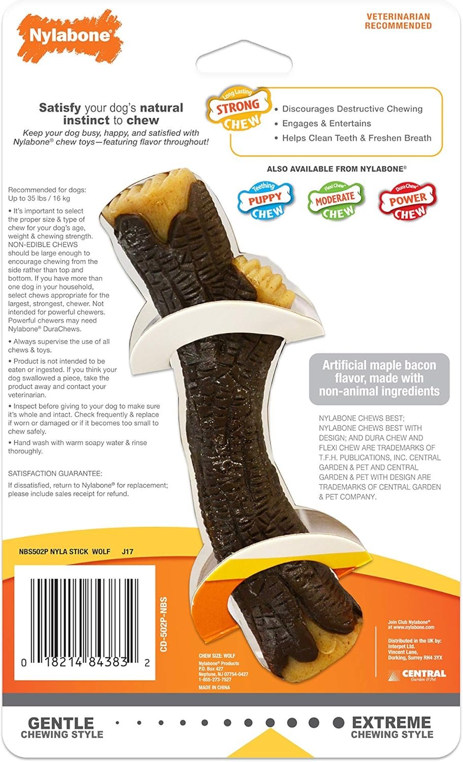 Strong dogs need durable, long-lasting chew toys. Our Strong Chew dog stick toy is made with real wood and provides a cleaner, safer alternative to sticks—no splintering or mess! It features delicious flavor dogs love throughout, keeping your furry friend happy while satisfying their natural urge to chew. Made with a unique bark texture, this dog toy that looks like a stick helps clean teeth and freshen breath as dogs chew. Occupy your best friend with this fun and tasty chew toy!