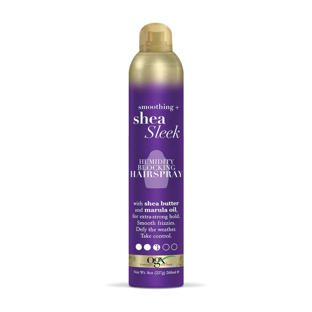Help fight frizz with this OGX Smoothing Shea Sleek Humidity Blocking Hairspray and take control of your hairstyle with an extra-strong hold. Infused with shea butter and marula oil, the styling hairspray moisturizes while keeping hair super smooth, soft, and manageable. Speed up blow dry time and provide heat protection up to 450°F without taking heat damage, drying out hair or making hair feel crunchy. Spray liberally the shea butter hairspray over dry hair and style hair as usual. Get what’s best for your straight, curly, short, long hair whether or not you rock a pixie cut, bob, blowout, color treatment or simply a natural look.