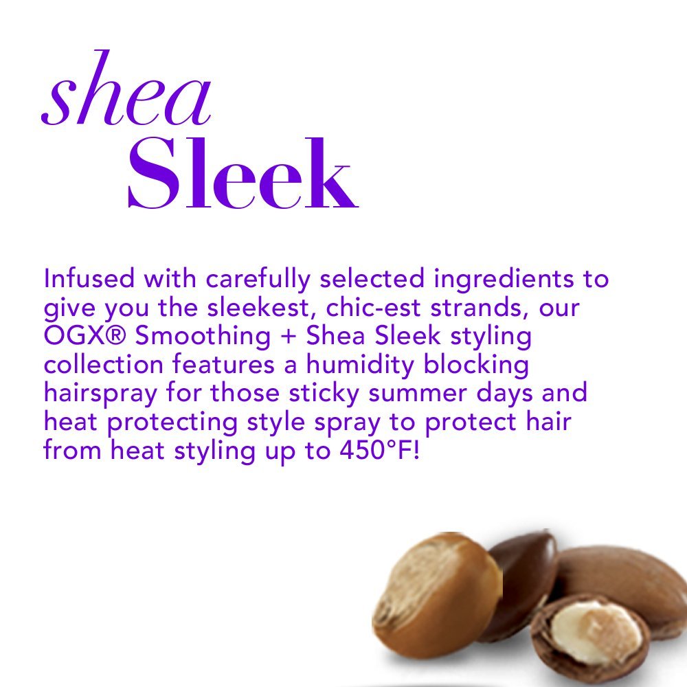 STRANDS ON SLEEK: Infused with carefully selected ingredients to give you the sleekest, chic-est strands, our OGX Smoothing + Shea Sleek styling collection blocks humidity and fights frizz to create hair that looks smoother, with less visible frizz.