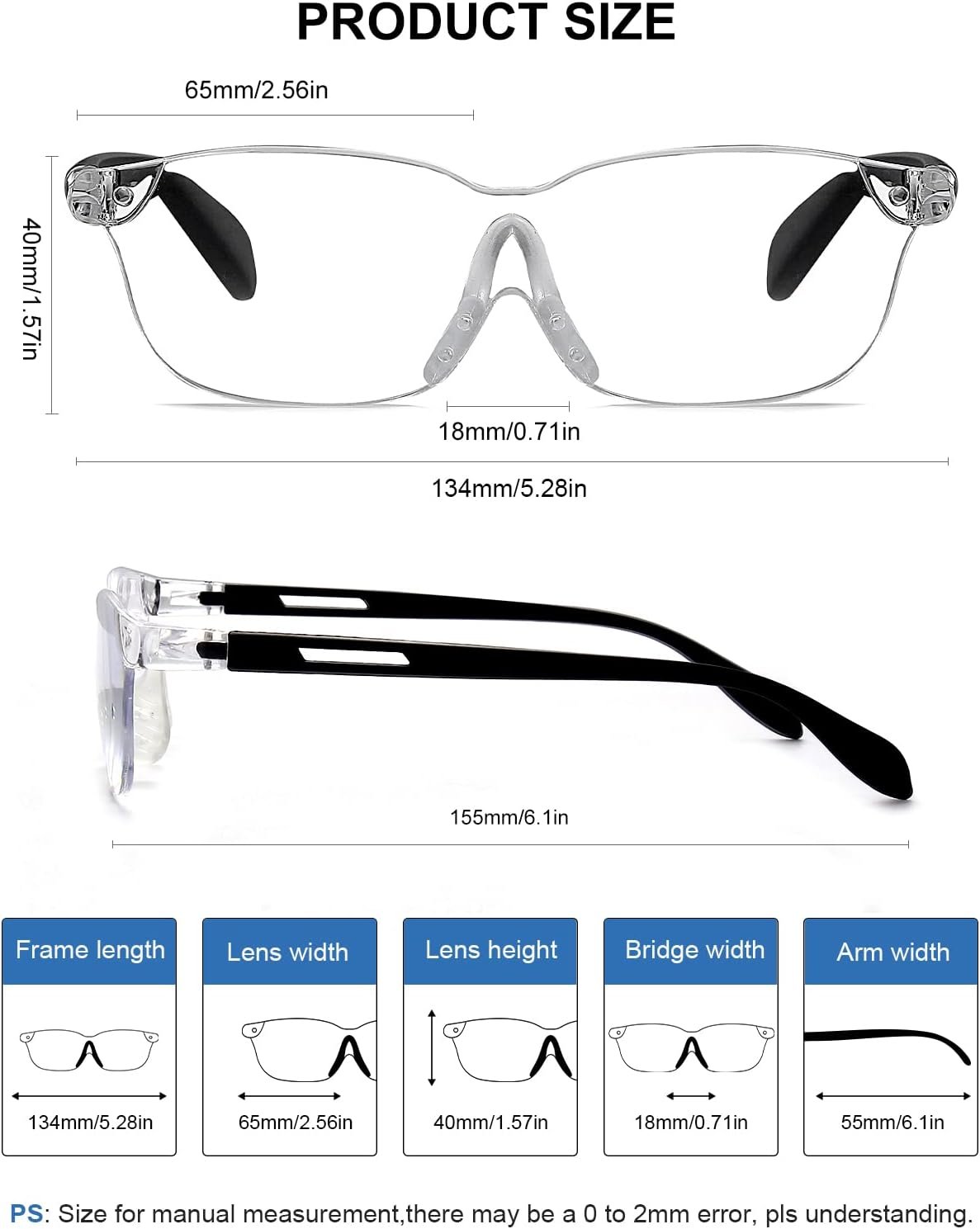 Lens Width: 65mm/2.56inLens Height: 40mm/1.57inTemple Length: 155mm/6.1inNose Bridge: 18mm/0.71in