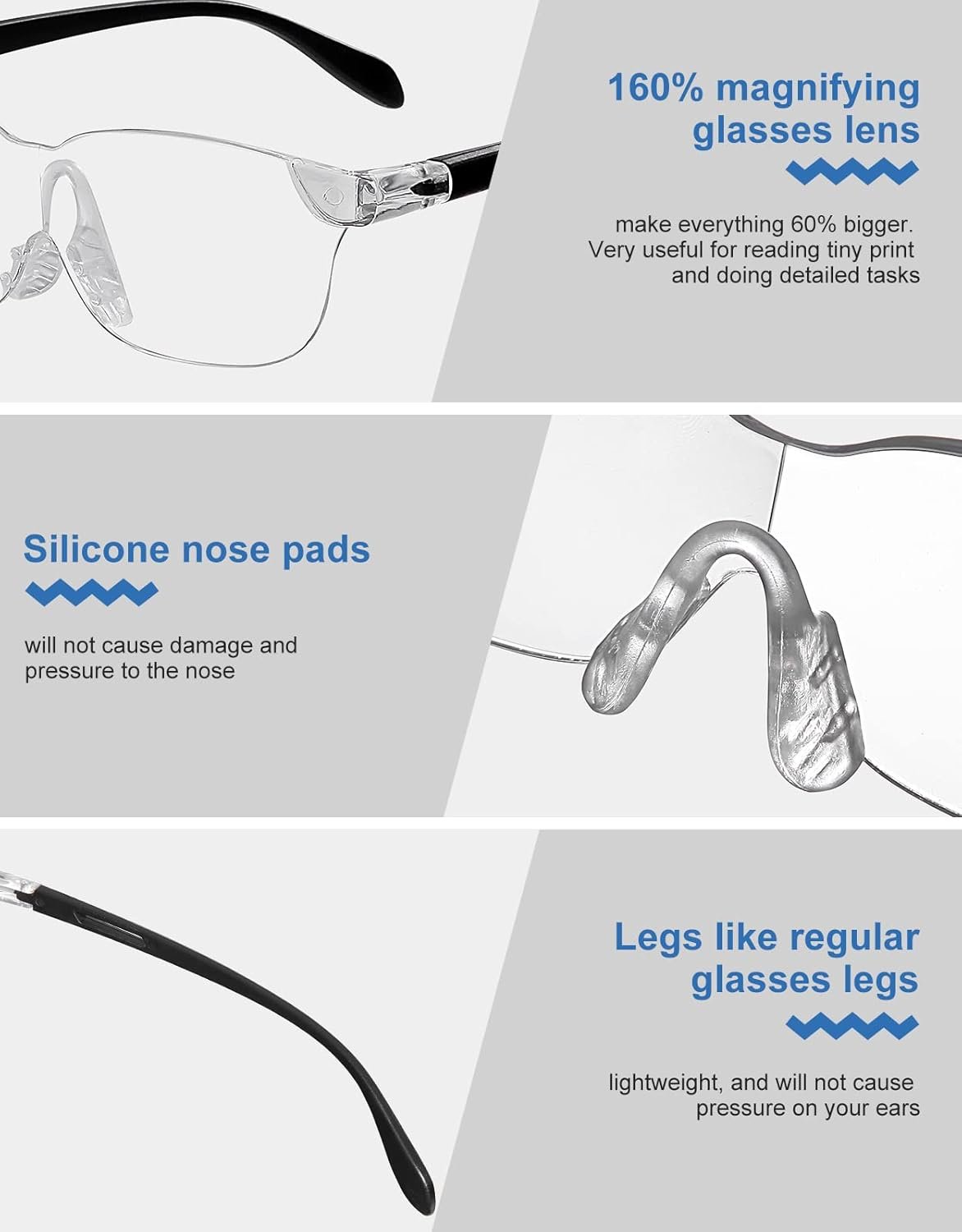 【 ULTRALIGHT & COMFORTABLE TO WEAR 】This magnifying glasses is ultra lightweight which will not cause pressure on your ears, user-friendly for long time wear. Clear scratch-proof lens, lightweight and anti-slip temples, soft silicone nose pad, all the superior details ensure you a comfortable wearing experience.
