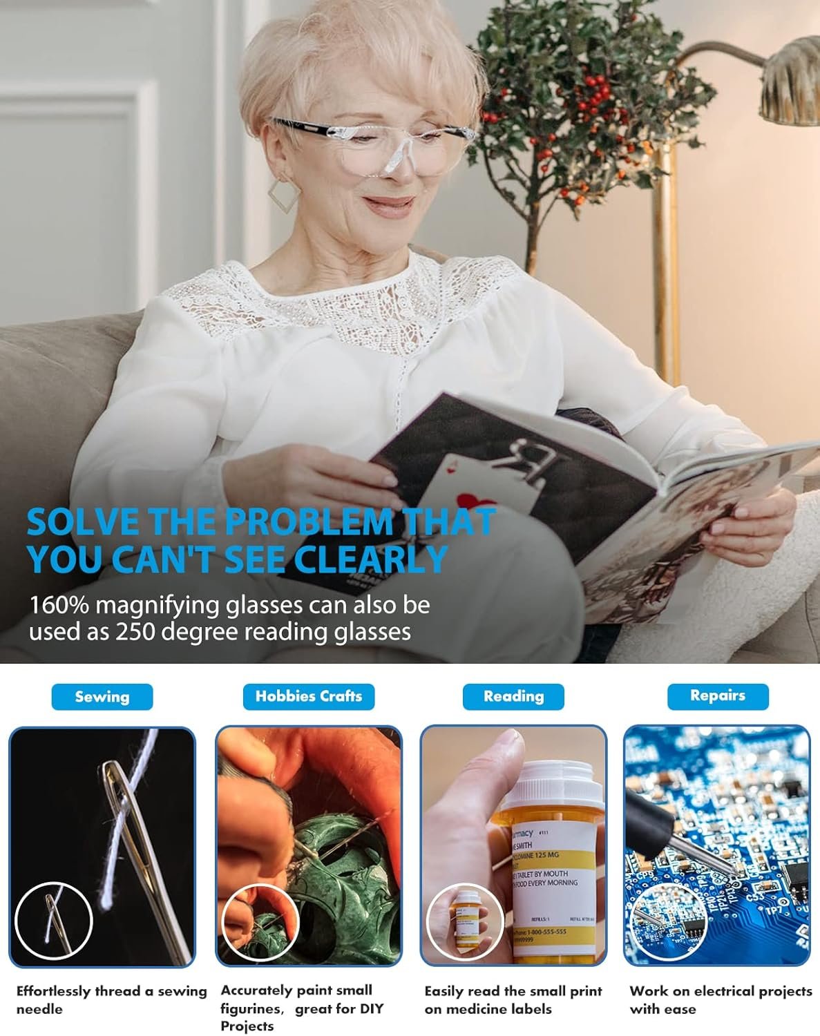 OKH magnifying glasses can be worn over prescription glasses, to meet everyone’s needs. It is perfect for any task such as reading tiny labels, making jewelry, watch repairing, painting, DIY crafts, sewing, knitting quilting, etc.