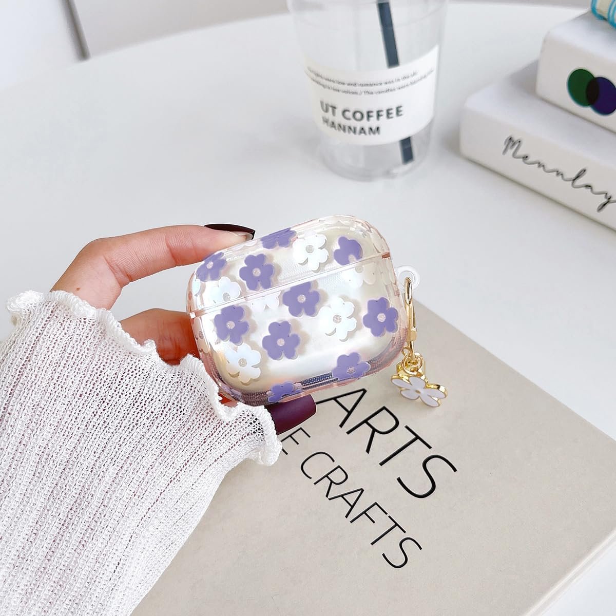 Olytop for Cute Airpods Pro 2nd/1st Generation Case Clear, Soft TPU Flower Air Pods Pro 2 Gen Cover Protective Skin Girl Women with Floral Keychain for iPod Pro 2/1 Gen 2023/2022/2019 – Purple