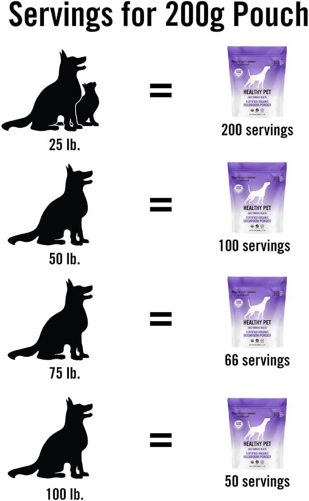 Instructions: For dogs & cats, administer 1 gram (approximately 1/2 teaspoon) per 25 lbs per day. Pouch contains 200 grams, so 100 servings for 50 lb pet or 200 servings for 25 lb pet.