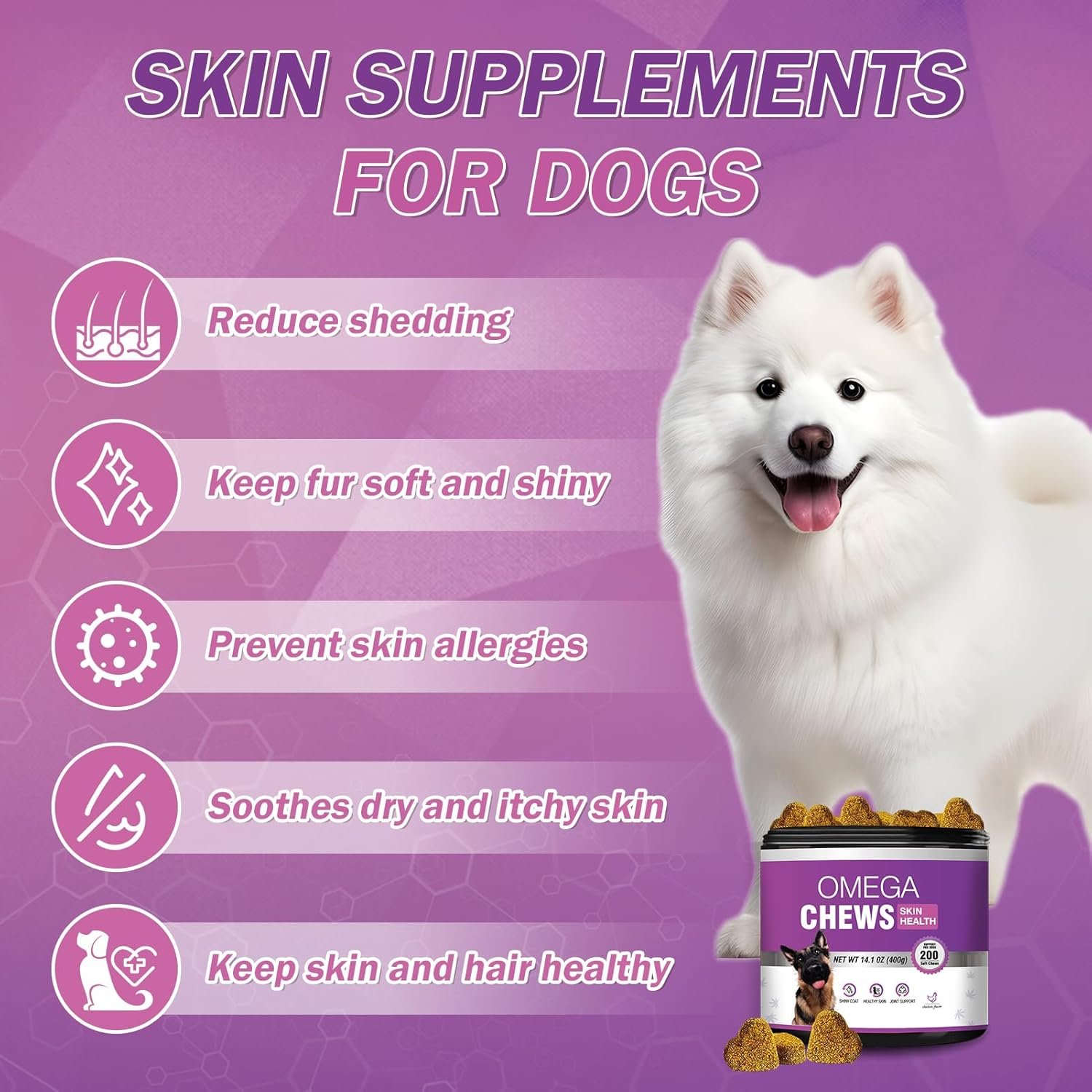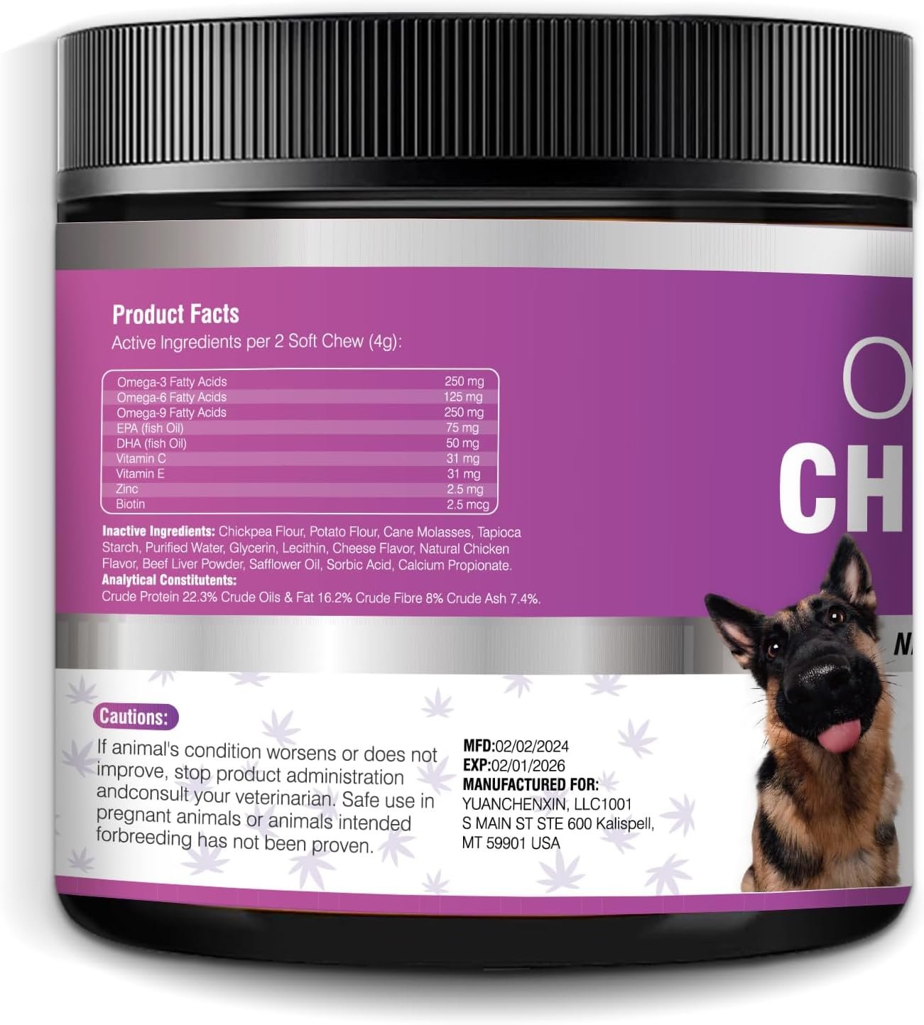 Healthy skin and shinny coat: With skin and coat supplement for dogs, your dog will enjoy healthy skin and shiny coat. This omega skin and coat chews for dogs provides the key vitamins and fatty acids your dog needs, fish oil supplements for dogs effectively promotes coat and skin health, skin supplements for dogs makes your dog’s skin softer. Skin and coat chews for dogs provides comprehensive skin and hair care for your pet, leaving your dog’s skin glowing.
