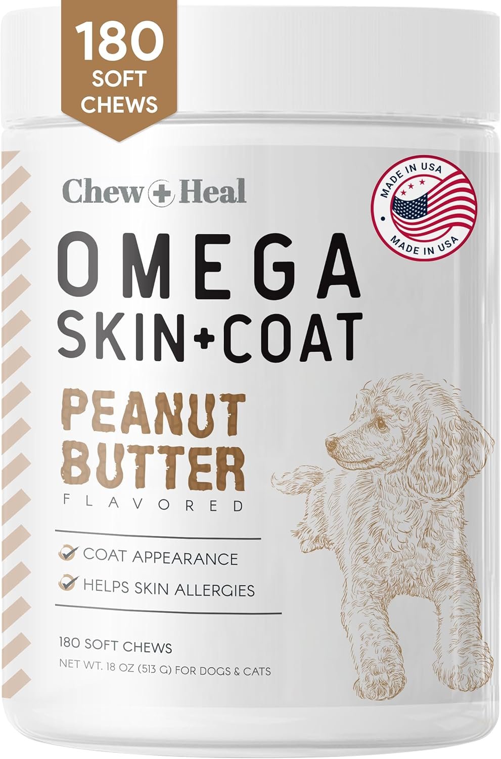 These dog skin and coat supplements are made in America and designed for small, large, and massive breed dogs. Recommended dosage varies by animal size; consult the package for more information.