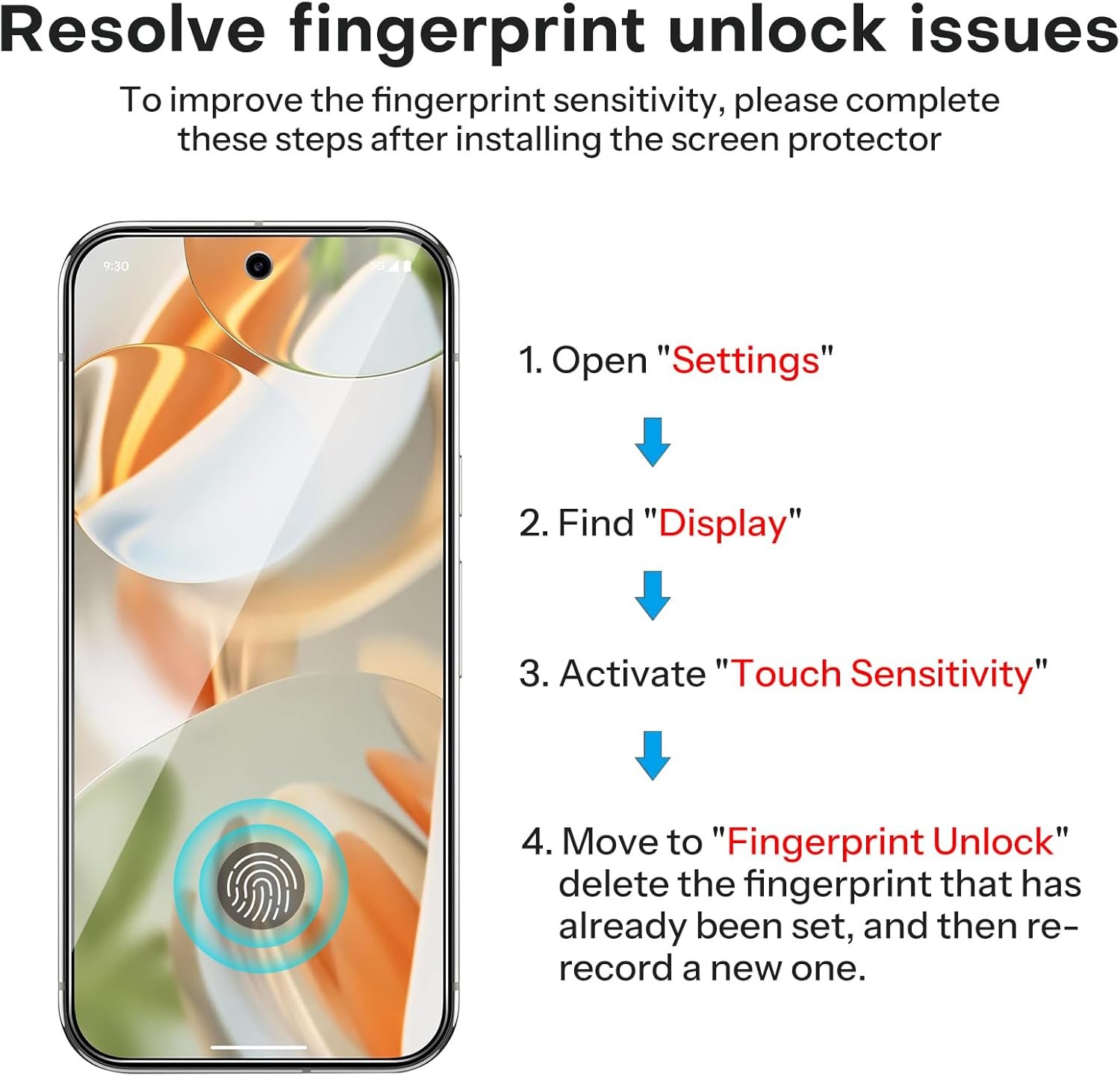 For people having problems with the Screen Protector not working with the Fingerprint Sensor on your Phone, you can go into the Settings and turn on Screen Protector Mode and Adaptive Touch.