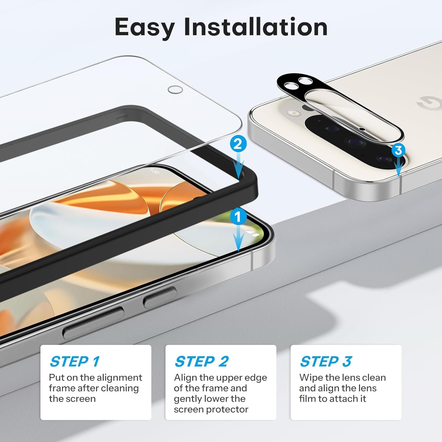 Double Protection: 9H hardness tempered glass screen protector protects the Google Pixel 9 Pro from scratches and abrasions. Special-designed camera lens protector keeps the phone camera free from smudge and fingerprints